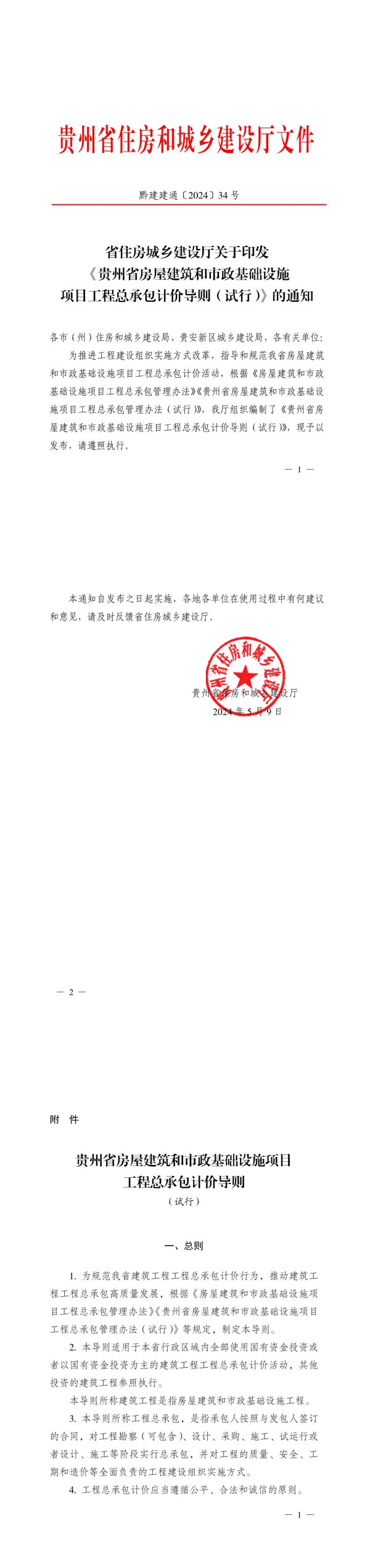 贵州省住房和城乡建设厅文件黔建建通[2024】34号省住房城乡建设厅关于印发《贵州省房屋建筑和市政基础设施项目工程总承包计价导则(试行)》的通知各市(州)住房和城乡建设局、贵安新区城乡建设局,各有关单位:为推进工程建设组织实施方式改革,指导和规范我省房屋建筑和市政基础设施项目工程总承包计价活动,根据《房屋建筑和市政基础设施项目工程总承包管理办法》《贵州省房屋建筑和市政基础设施项目工程总承包管理办法(试行)》,我厅组织编制了《贵州省房屋建筑和市政基础设施项目工程总承包计价导则(试行),现予以发布,请遵照执行。—1—