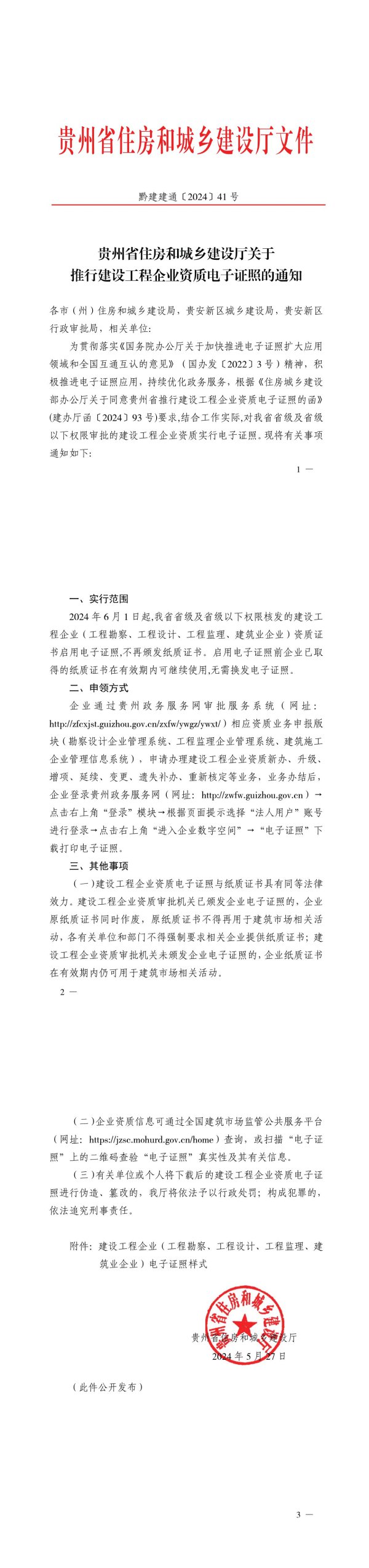 贵州省住房和城乡建设厅文件黔建建通[2024】41号贵州省住房和城乡建设厅关于推行建设工程企业资质电子证照的通知各市(州)住房和城乡建设局,贵安新区城乡建设局,贵安新区行政审批局,相关单位:为贯彻落实《国务院办公厅关于加快推进电子证照扩大应用领域和全国互通互认的意见》(国办发[2022】3号)精神,积极推进电子证照应用,持续优化政务服务,根据《住房城乡建设部办公厅关于同意贵州省推行建设工程企业资质电子证照的函》(建办厅函[2024】93号)要求,结合工作实际,对我省省级及省级以下权限审批的建设工程企业资质实行电子证照。现将有关事项通知如下:1一