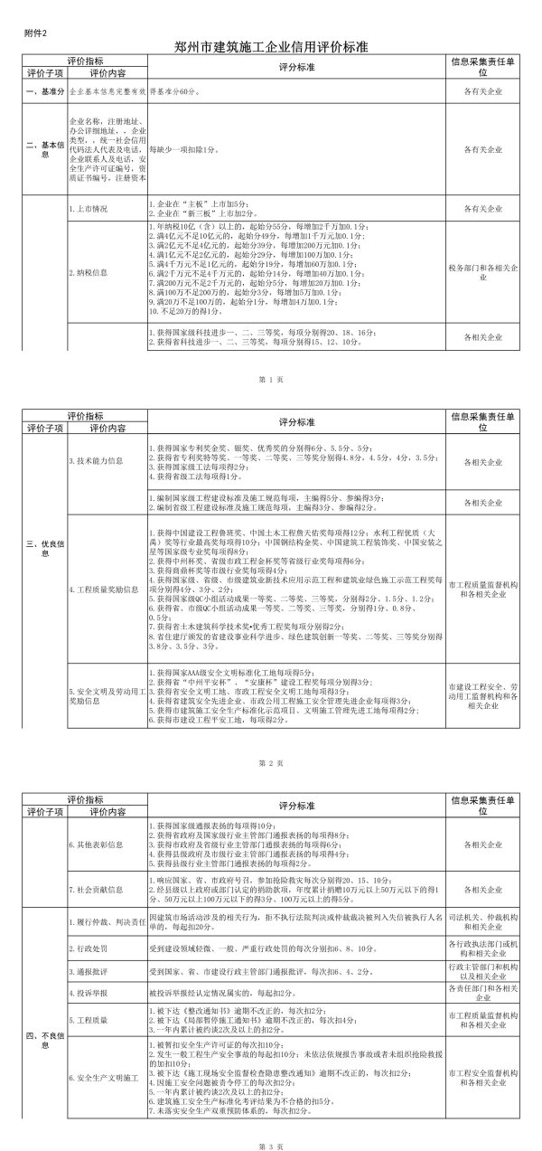 附件2郑州市建筑施工企业信用评价标准评价指标评分标准信息采集责任单评价子项评价内容位一、基准分企业基本信息完整有效得基准分60分。各有关企业企业名称,注册地址、办公详细地址,,企业二、基本信类型,,统一社会信息代码法人代表及电话,每缺少一项扣除1分。各有关企业企业联系人及电话,安全生产许可证编号,资质证书编号,注册资本1.上市情况1.企业在“主板”上市加5分;2.企业在“新三板”上市加2分。各有关企业1.年纳税10亿(含)以上的,起始分55分,每增加2千万加0.1分;2.满4亿元不足10亿元的,起始分49分,每增加1千万元加0.1分;3.满2亿元不足4亿元的,起始分39分,每增加200万元加0.1分;4.满1亿元不足2亿元的,起始分29分,每增加100万加0.1分;5.满4千万元不足1亿元的,起始分19分,每增加60万加0.1分;2.纳税信息6.满2千万元不4千万元的,起始分14分,每增加40万加0.1分;税务部门和各相关企7.满200万元不足2千万元的,起始分5分,每增加20万加0.1分;业8.满100万不足200万的,起始分3分,每增加5万加0.1分;9.满20万不足100万的,起始分1分,每增加4万加0.1分;10.不足20万的得1分。1.获得国家级科技进步、二、三等奖,每项分别得20、18、16分;2.获得省科技进步一、二、三等奖,每项分别得15、12、10分。各相关企业第1页