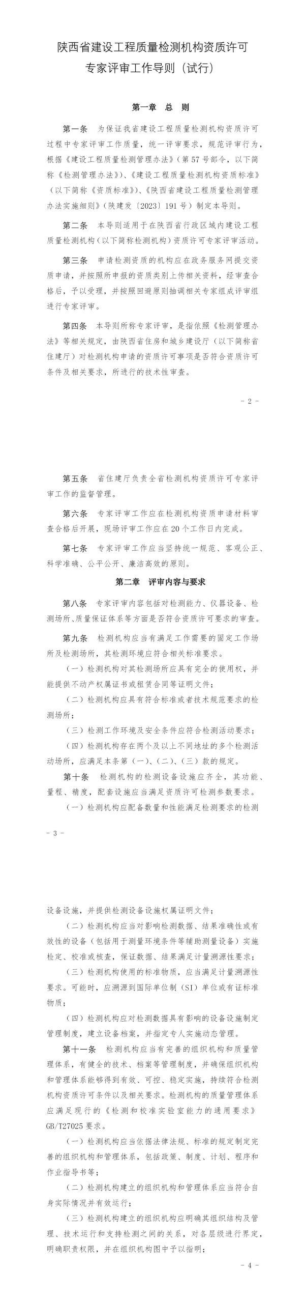 第一条为保证我省建设工程质量检测机构资质许可过程中专家评审工作质量,统一评审要求,规范评审行为,根据《建设工程质量检测管理办法》(第57号部令,以下简称《检测管理办法》)、《建设工程质量检测机构资质标准》(以下简称《资质标准》)、《陕西省建设工程质量检测管理办法实施细则》(陕建发〔2023〕191号)制定本导则。