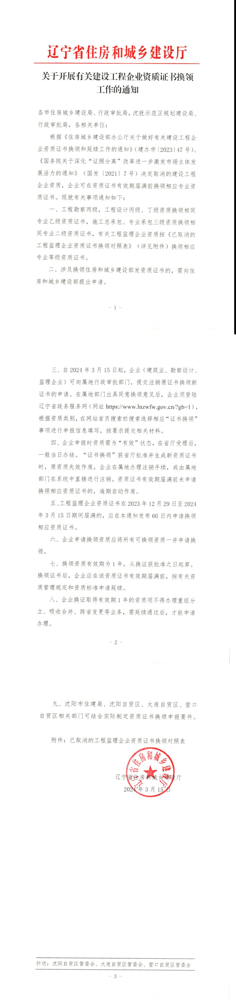 九、沈阳市住建局、沈阳自贸区、大连自贸区、营口自贸区相关部门可结合实际制定资质证书换领申报要件。附件:已取消的工程监理企业资质证书换领对照表住房和城乡辽宁省住房和城省4建厅20244年3月15抄送:沈阳自贸区管委会、大连自贸区管委会、营口自贸区管委会3-