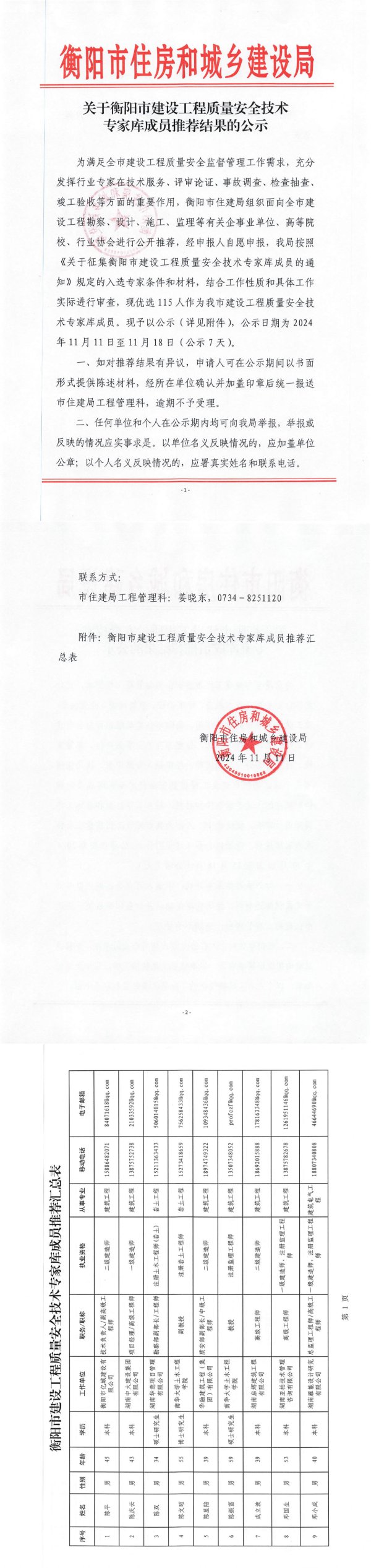 衡阳市住房和城乡建设局关于衡阳市建设工程质量安全技术专家库成员推荐结果的公示为满足全市建设工程质量安全监督管理工作需求,充分发挥行业专家在技术服务、评审论证、事故调查、检查抽查、竣工验收等方面的重要作用,衡阳市住建局组织面向全市建设工程勘察、设计、施工、监理等有关企事业单位、高等院校、行业协会进行公开推荐,经申报人自愿申报,我局按照《关于征集衡阳市建设工程质量安全技术专家库成员的通知》规定的入选专家条件和材料,结合工作性质和具体工作实际进行审查,现优选115人作为我市建设工程质量安全技术专家库成员。现予以公示(详见附件),公示日期为2024年11月11日至11月18日(公示7天)。一、如对推荐结果有异议,申请人可在公示期间以书面形式提供陈述材料,经所在单位确认并加盖印章后统一报送市住建局工程管理科,逾期不予受理。二、任何单位和个人在公示期内均可向我局举报,举报或反映的情况应实事求是。以单位名义反映情况的,应加盖单位公章;以个人名义反映情况的,应署真实姓名和联系电话。-1
