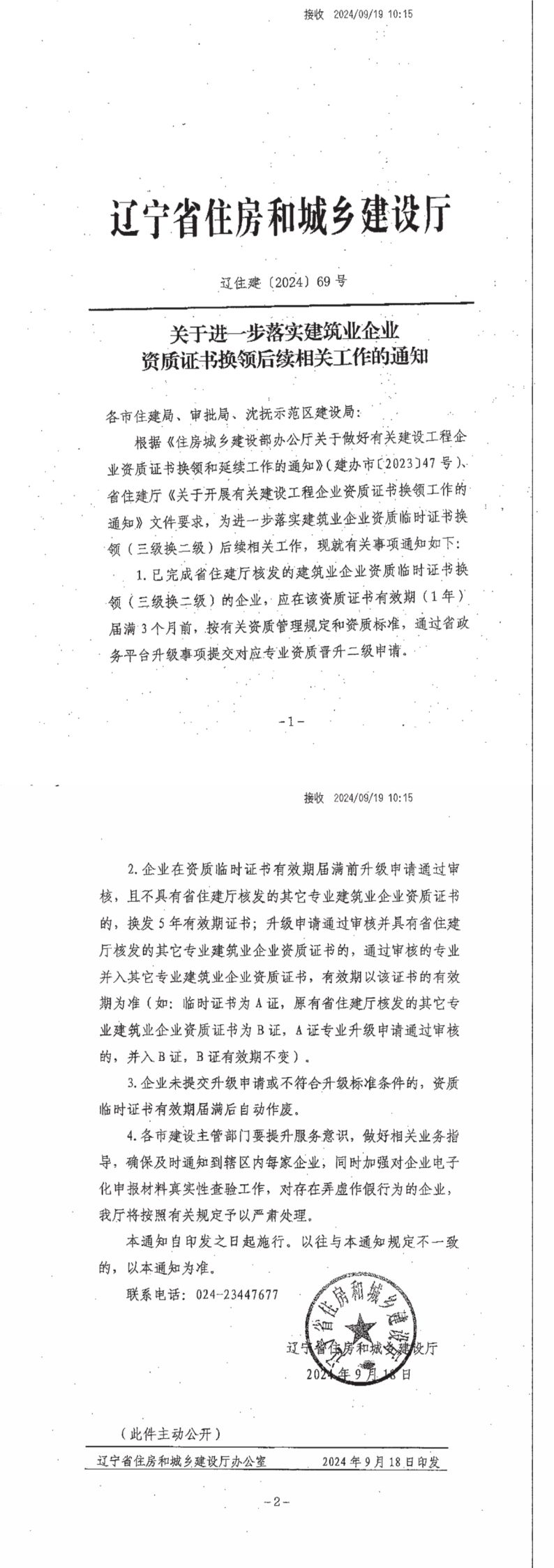 接收2024/09/1910:152.企业在资质临时证书有效期届满前升级申请通过审核,且不具有省住建厅核发的其它专业建筑业企业资质证书的,换发5年有效期证书;升级申请通过审核并具有省住建厅核发的其它专业建筑业企业资质证书的,通过审核的专业并入其它专业建筑业企业资质证书,有效期以该证书的有效期为准(如:临时证书为A证,原有省住建厅核发的其它专业建筑业企业资质证书为B证,A证专业升级申请通过审核的,并入B证,B证有效期不变)。3.企业未提交升级申请或不符合升级标准条件的,资质临时证书有效期届满后自动作废。4.各市建设主管部门要提升服务意识,做好相关业务指导,确保及时通知到辖区内每家企业;同时加强对企业电子化申报材料真实性查验工作,对存在弄虚作假行为的企业,我厅将按照有关规定予以严肃处理。本通知自印发之日起施行。以往与本通知规定不一致的,以本通知为准。联系电话:024-23447677一住房城-辽和厅2024年9月18日(此件主动公开)辽宁省住房和城乡建设厅办公室2024年9月18日印发-2-