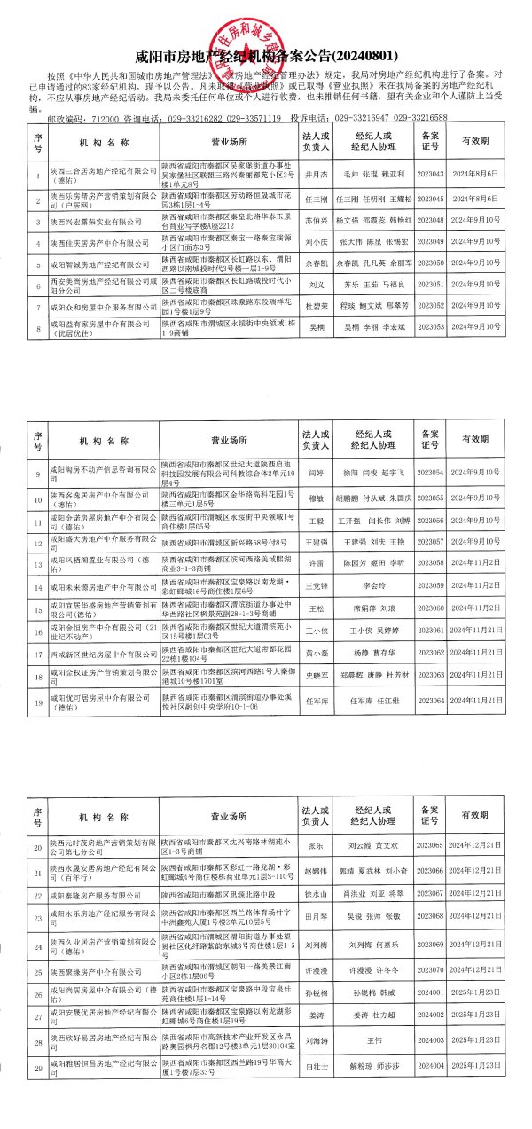 咸阳市房地经纪机梅备案公告(20240801)房和r按照《中华人民共和国城市房地产管理法》房地产管理办法》规定,我局对房地产经纪机构进行了备案。对构,不应从事房地产经纪活动。我局未委托任何单位或个人进行收费,也未推销任何书籍,望有关企业和个人谨防上当受已申请通过的83家经纪机构,现予以公告。凡未取得业我照》或已取得《营业执照》未在我局备案的房地产经纪机骗。邮政编码:712000咨询电话:029-33216282029-33571119投诉电话:029-33216947029-33216588序号机构名称营业场所法人或经纪人或负责人经纪人协理证号备案有效期陕西三合居房地产经纪有限公司陕西省咸阳市秦都区吴家堡街道办事处1(德佑)吴家堡社区联盟三路兴秦丽都苑小区3号井月杰毛帅张琨赖亚利20230432024年8月6日楼1单元8号2陕西乐房帮房产营销策划有限公陕西省咸阳市秦都区劳动路恒晟城市花司(户居网)园3栋1层1-4号任三刚任三刚任明刚王耀松20230452024年8月6日3陕西兴宏露荣实业有限公司陕西省咸阳市秦都区秦皇北路华泰玉景台商业写字楼A座2212苏伯兴杨文强邵霞蕊韩艳红20230482024年9月10号4陕西佳庆居房产中介有限公司陕西省咸阳市秦都区秦宝一路秦宝瑞源小区门面东3号刘小庆张大伟陈星张锡宏20230492024年9月10号5咸阳智诚房地产经纪有限公司陕西省咸阳市秦都区长虹路以东、渭阳西路以南城投时代3号楼一层1-9号余春凯余春凯孔凡英余丽军20230502024年9月10号6西安美尚房地产经纪有限公司咸陕西省咸阳市秦都区长虹路城投时代小阳分公司区二号楼底商刘义苏乐王茹马福良20230512024年9月10号7咸阳众和房屋中介服务有限公司陕西省咸阳市秦都区珠泉路东段瑞祥花园1号楼1层9号杜碧荣程琰鲍文斌邢翠芳20230522024年9月10号8咸阳益有家房屋中介有限公司陕西省咸阳市渭城区永绥街中央领域1栋(优居优住)1-9商铺吴桐吴桐李丽李宏斌20230532024年9月10号