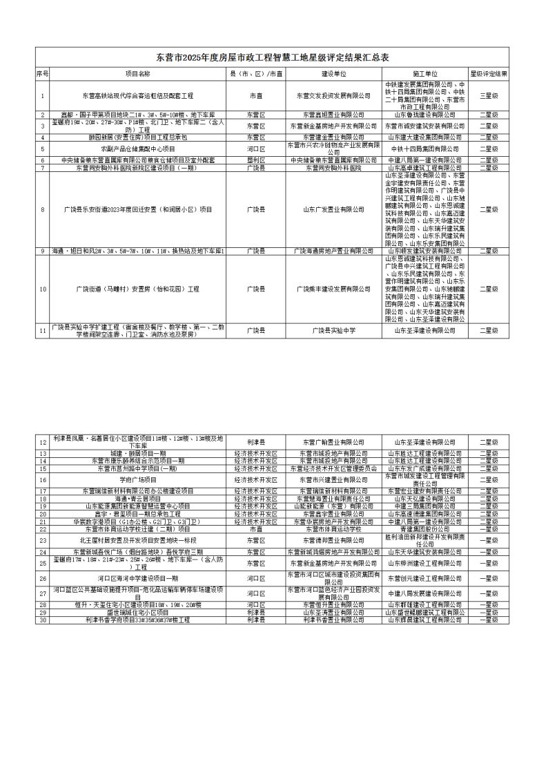 东营市2025年度房屋市政工程智慧工地星级评定结果汇总表