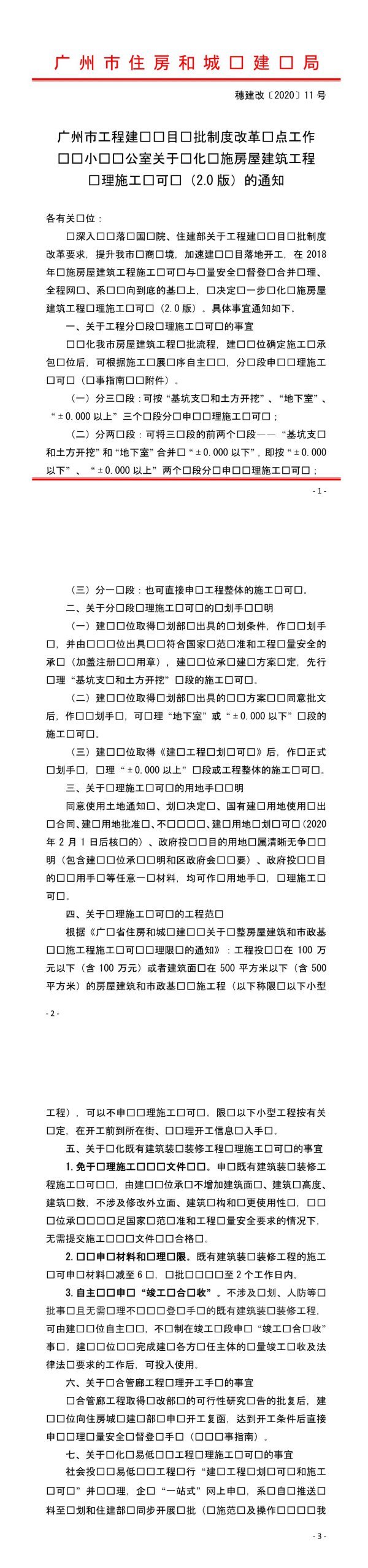 广州市住房和城口建□局穗建改[2020〕11号广州市工程建□□目□批制度改革□点工作□□小□□公室关于□化口施房屋建筑工程□理施工□可□(2.0版)的通知各有关□位:□深入□□落□国□院、住建部关于工程建□□目□批制度改革要求,提升我市□商□境,加速建□□目落地开工,在2018年□施房屋建筑工程施工□可□与□量安全□督登□合并□理、全程□、系□□向到底的基□上,□决定□一步□化□施房屋建筑工程□理施工□可□(2.0版)。具体事宜通知如下。一、关于工程分□段□理施工□可□的事宜□□化我市房屋建筑工程□批流程,建□□位确定施工□承包□位后,可根据施工□展□序自主,分□段申□□理施工□可□(□事指南□□附件)。()分三段:可按“基坑支□和土开挖”、“地下室”、“±0.000以上”三个□段分□申□□理施工□可口;(二)分两□段:可将三□段的前两个□段“基坑□和土开挖”和“地下室”合并“±0.000以下”,即按“±0.000以下”、“±0.000以上”两个段分□申理施工可;-1
