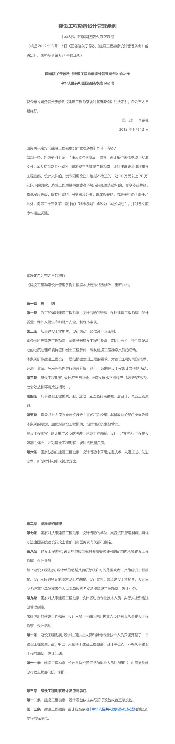 本决定自公布之日起施行。《建设工程勘察设计管理条例》根据本决定作相应修改,重新公布。第一章总则第一条为了加强对建设工程勘察、设计活动的管理,保证建设工程勘察、设计质量,保护人民生命和财产安全,制定本条例。第二条从事建设工程勘察、设计活动,必须遵守本条例。本条例所称建设工程勘察,是指根据建设工程的要求,查明、分析、评价建设场地的地质地理环境特征和岩土工程条件,编制建设工程勘察文件的活动。本条例所称建设工程设计,是指根据建设工程的要求,对建设工程所需的技术、经济、资源、环境等条件进行综合分析、论证,编制建设工程设计文件的活动。第三条建设工程勘察、设计应当与社会、经济发展水平相适应,做到经济效益、社会效益和环境效益相统一。第四条从事建设工程勘察、设计活动,应当坚持先勘察、后设计、再施工的原则。第五条县级以上人民政府建设行政主管部门和交通、水利等有关部门应当依照本条例的规定,加强对建设工程勘察、设计活动的监督管理。建设工程勘察、设计单位必须依法进行建设工程勘察、设计,严格执行工程建设强制性标准,并对建设工程勘察、设计的质量负责。第六条国家鼓励在建设工程勘察、设计活动中采用先进技术、先进工艺、先进设备、新型材料和现代管理方法。
