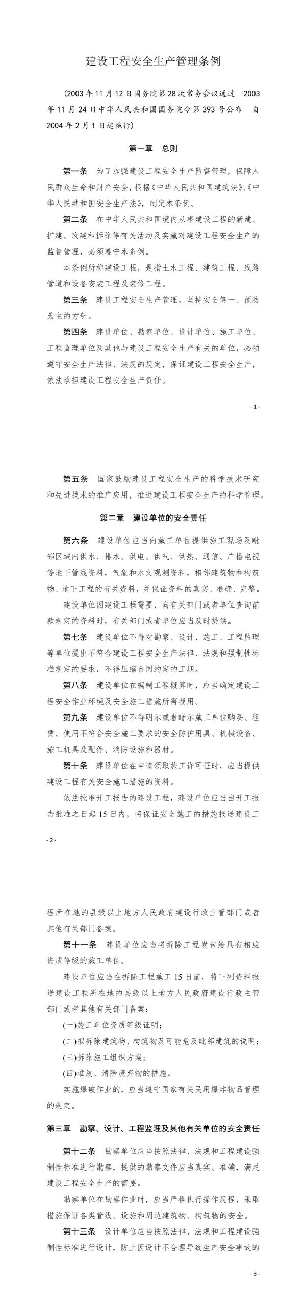 建设工程安全生产管理条例(2003年11月12日国务院第28次常务会议通过2003年11月24日中华人民共和国国务院令第393号公布自2004年2月1日起施行)第一章总则第一条为了加强建设工程安全生产监督管理,保障人民群众生命和财产安全,根据《中华人民共和国建筑法》、《中华人民共和国安全生产法》,制定本条例。第二条在中华人民共和国境内从事建设工程的新建、扩建、改建和拆除等有关活动及实施对建设工程安全生产的监督管理,必须遵守本条例。本条例所称建设工程,是指土木工程、建筑工程、线路管道和设备安装工程及装修工程。第三条建设工程安全生产管理,坚持安全第一、预防为主的方针。第四条建设单位、勘察单位、设计单位、施工单位、工程监理单位及其他与建设工程安全生产有关的单位,必须遵守安全生产法律、法规的规定,保证建设工程安全生产,依法承担建设工程安全生产责任。-1-
