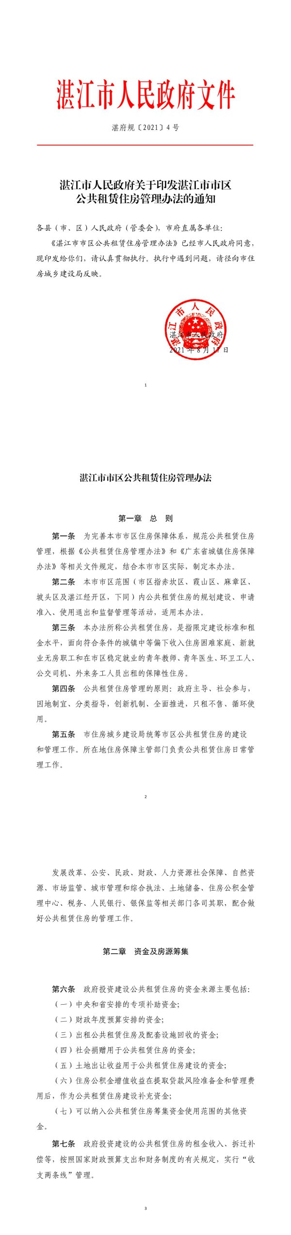湛江市人民政府文件湛府规[2021】4号湛江市人民政府关於印发湛江市市区公共租赁住房管理办法的通知各县(市、区)人民政府(管委会),市府直属各单位:《湛江市市区公共租赁住房管理办法》已经市人民政府同意,现印发给你们,请认真贯彻执行。执行中遇到问题,请径向市住房城乡建设局反映。市出网湛江发国日
