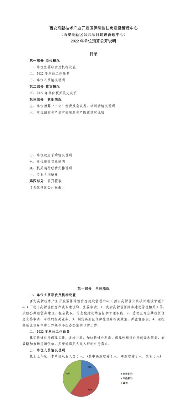第一部分单位概况一、单位主要职责及机构设置西安高新技术产业开发区保障性住房建设管理中心(西安高新区公共项目建设管理中心)下设于高新区住房和城乡建设局。主要职责:1、负责高新区保障房建设管理相关工作,承担公共租赁房建设、租金收取、信息化建设的监督和管理职能;2、受理区内公共租赁住房资格申请、审核的相关业务;3、制定高新区保障性住房相关政策,并监督落实;4、承担高新区住房保障工作领导小组办公室的日常工作。二、2022年单位工作任务扎实推进住房保障工作,多措并举,加快推进公租房、保障性租赁住房建设和筹集,有效增加市场房源供给,多渠道满足各类人群的住房需求。三、单位人员情况说明截止上年底,本单位从业人员5人。(其中高级职称1人,中级职称2人,其他3人)20%40%■高级职称■中级职称■其他40%