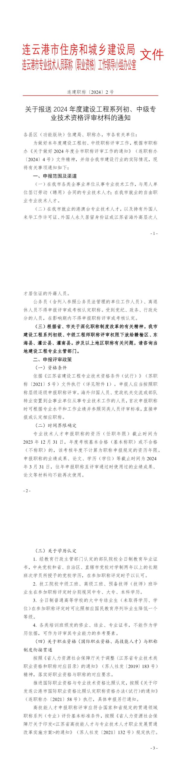 为做好本年度建设工程初、中级职称评审工作,根据市职称办《关于做好2024年度全市职称评审工作的通知》(连职称办〔2024〕4号)文件精神,并结合我市建设行业的实际情况,现将有关事项通知如下: