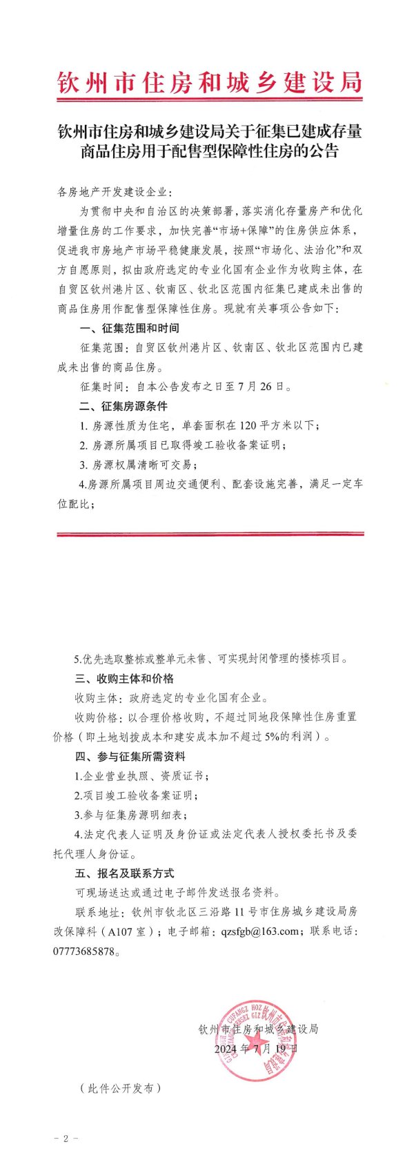 钦州市住房和城乡建设局钦州市住房和城乡建设局关于征集已建成存量商品住房用于配售型保障性住房的公告各房地产开发建设企业:为贯彻中央和自治区的决策部署,落实消化存量房产和优化增量住房的工作要求,加快完善“市场+保障”的住房供应体系,促进我市房地产市场平稳健康发展,按照“市场化、法治化”和双方自愿原则,拟由政府选定的专业化国有企业作为收购主体,在自贸区钦州港片区、钦南区、钦北区范围内征集已建成未出售的商品住房用作配售型保障性住房。现就有关事项公告如下:一、征集范围和时间征集范围:自贸区钦州港片区、钦南区、钦北区范围内已建成未出售的商品住房。征集时间:自本公告发布之日至7月26日。-二、征集房源条件1.房源性质为住宅,单套面积在120平方米以下;2.房源所属项目已取得竣工验收备案证明;3.房源权属清晰可交易;4.房源所属项目周边交通便利、配套设施完善,满足一定车位配比;