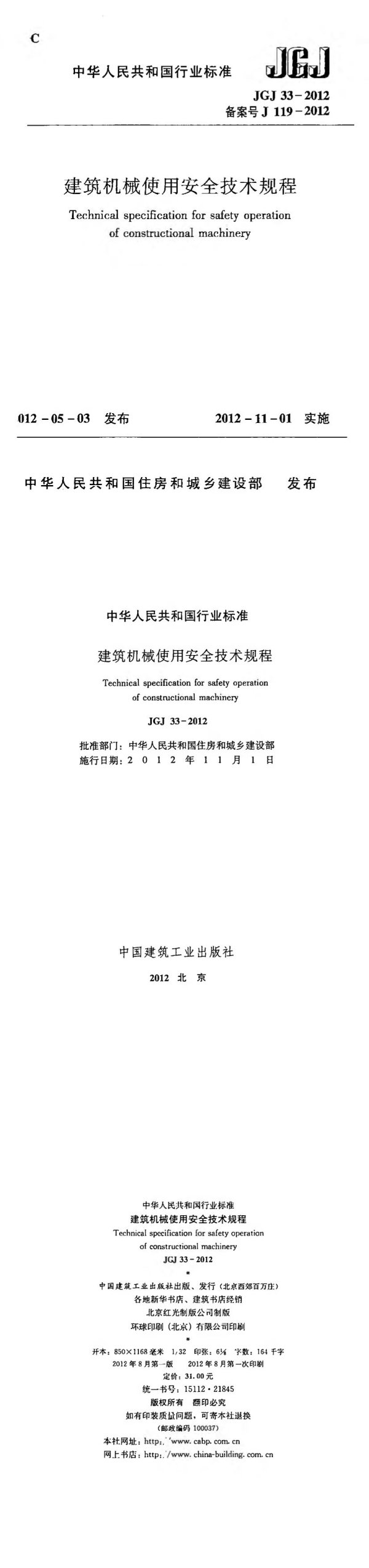 中华人民共和国行业标准建筑机械使用安全技术规程TechnicalspecificationforsafetyoperationofconstructionalmachineryJGJ33-2012*中国建筑工业出版社出版、发行(北京西郊百万庄)各地新华书店、建筑书店经销北京红光制版公司制版环球印刷(北京)有限公司印刷÷开本:850×1168毫米132印张:6字数:164千字2012年8月第一版2012年8月第一次印刷定价:31.00元统一书号:15112·21845版权所有翻印必究如有印装质量问题,可寄本社退换(邮政编码100037)本社网址:http:'www.cabp.com.cn网上书店:http:/www.china-building.com.cn