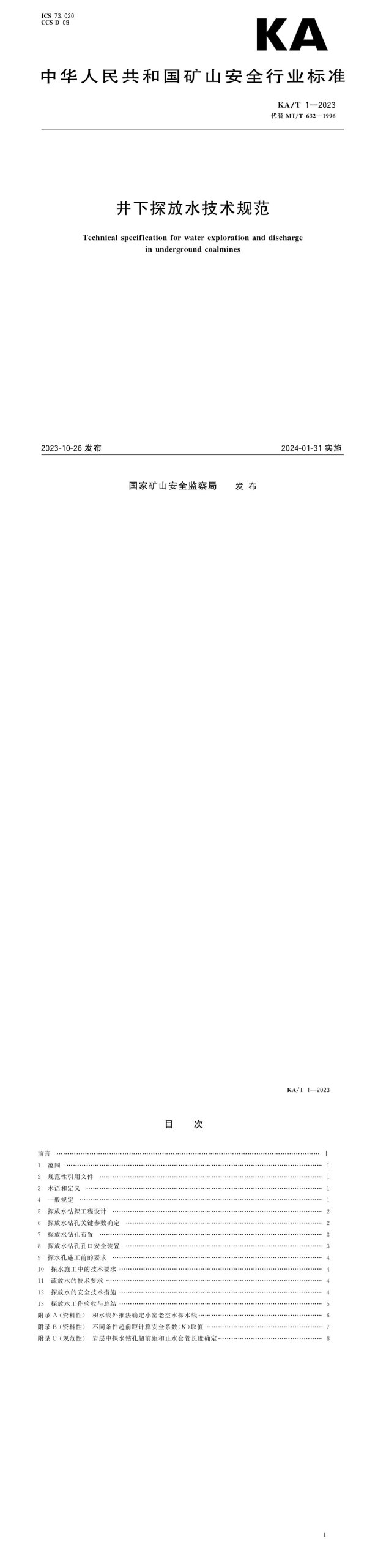 CCSD09ICS73.020KA中华人民共和国矿山安全行业标准KA/T1—2023代替MT/T632—1996井下探放水技术规范Technicalspecificationforwaterexplorationanddischargeinundergroundcoalmines2023-10-26发布2024-01-31实施国家矿山安全监察局发布