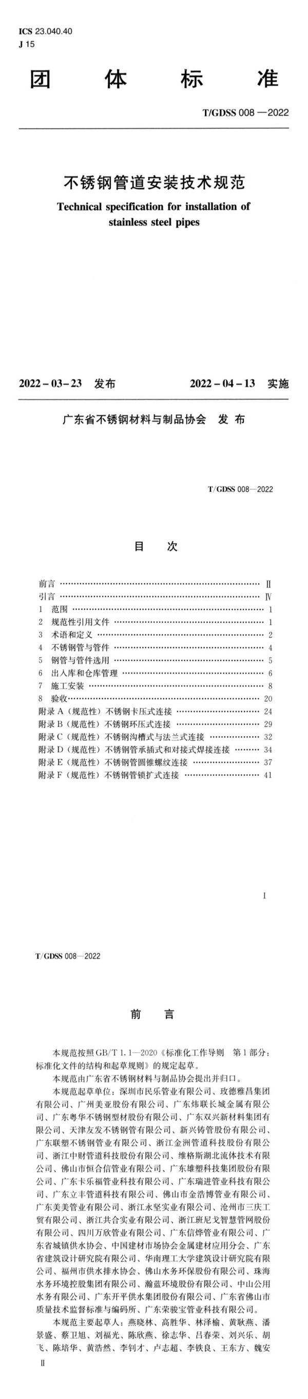 ICS23.040.40J15团体标准T/GDSS008—2022不锈钢管道安装技术规范Technicalspecificationforinstallationofstainlesssteelpipes2022-03-23发布2022-04-13实施广东省不锈钢材料与制品协会发布