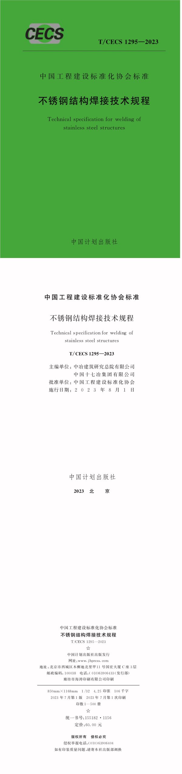 中国工程建设标准化协会公告第1491号关于发布《不锈钢结构焊接技术规程》的公告根据中国工程建设标准化协会《关于印发<2016年第一批工程建设协会标准制订、修订计划>的通知》(建标协字[2016】038号)的要求,由中冶建筑研究总院有限公司、中国十七治集团有限公司等单位编制的《不锈钢结构焊接技术规程》,经协会结构焊接专业委员会组织审查,现批准发布,编号为T/CECS1295一2023,自2023年8月1日起施行。中国工程建设标准化协会二〇二三年三月十六日