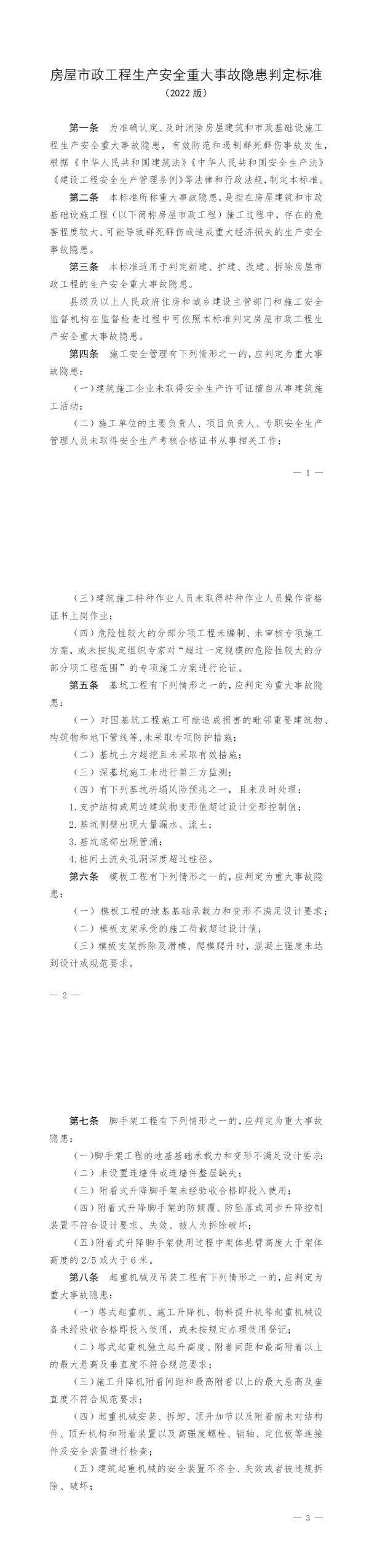 第一条为准确认定、及时消除房屋建筑和市政基础设施工程生产安全重大事故隐患,有效防范和遏制群死群伤事故发生,根据《中华人民共和国建筑法》《中华人民共和国安全生产法》《建设工程安全生产管理条例》等法律和行政法规,制定本标准。
