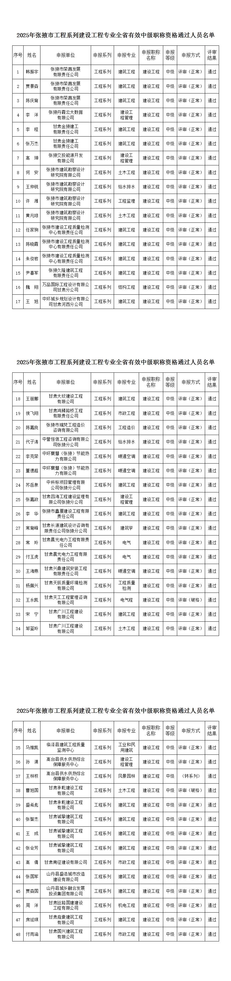 2025年张掖市工程系列建设工程专业全省有效中级职称资格通过人员名单