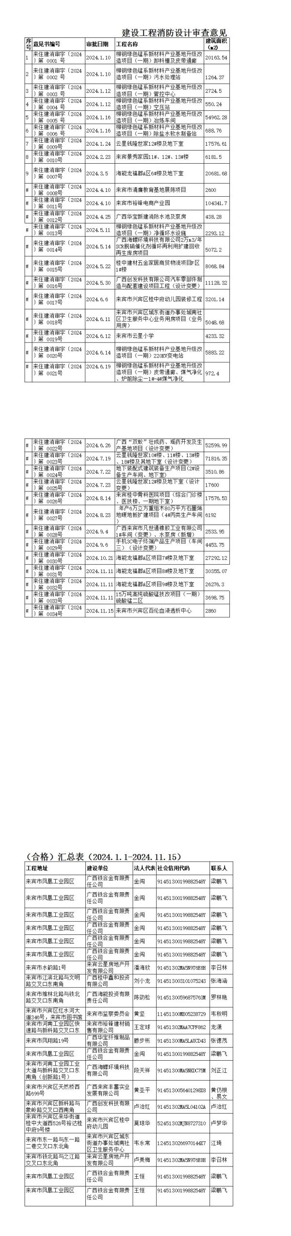 建设工程消防设计审查意见(合格)汇总表(2024.1.1-2024.11.15)