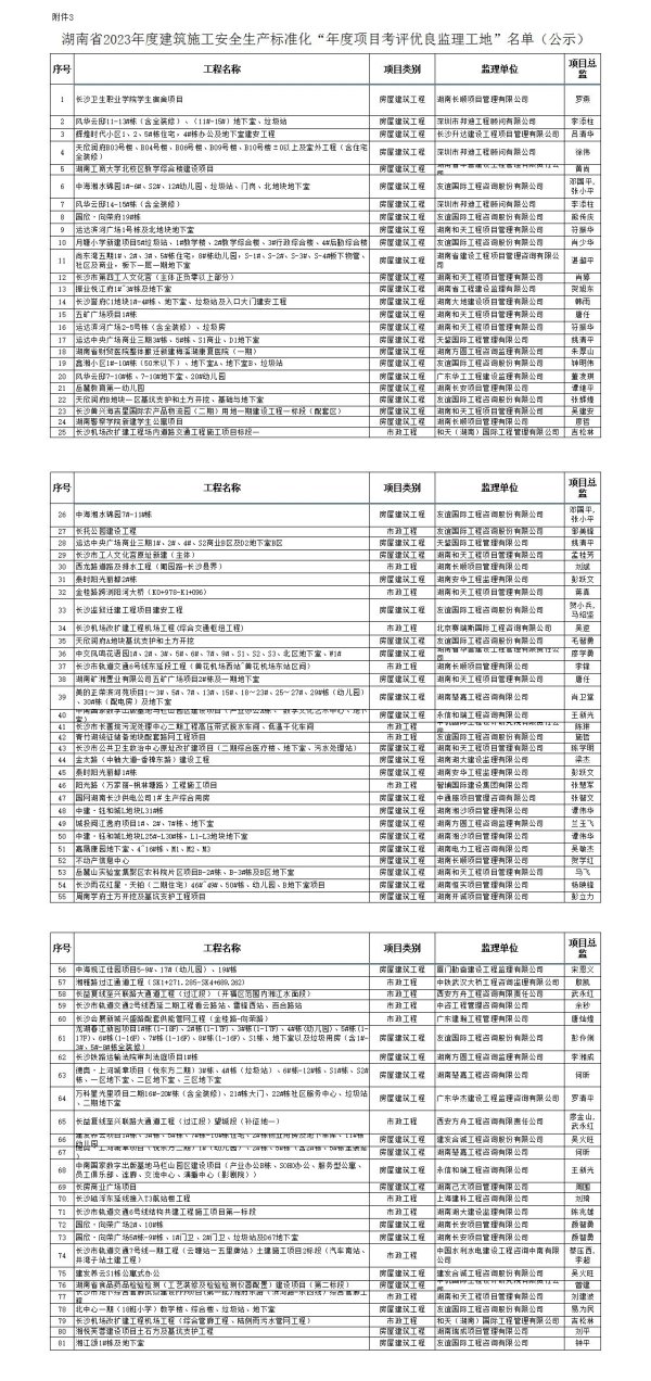 湖南省2023年度建筑施工安全生产标准化“年度项目考评优良监理工地”名单(公示)