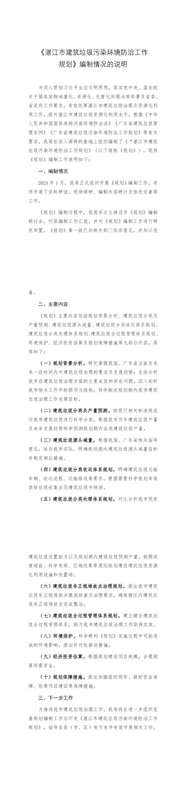 为深入贯彻习近平生态文明思想,落实党中央、国务院关于固体废物减量化、资源化、无害化处理决策部署及省委、省政府工作要求,有效统筹湛江市建筑垃圾治理及资源化利用工作,提升湛江市建筑垃圾资源化利用水平,根据《中华人民共和国固体废物污染环境防治法》《广东省建筑垃圾管理条例》《广东省建筑垃圾污染环境防治工作规划》等有关要求,我局在深入调研的基础上组织编制了《“湛江市建筑垃圾污染环境防治工作规划》(以下简称《规划》),现将《规划》编制工作说明如下: