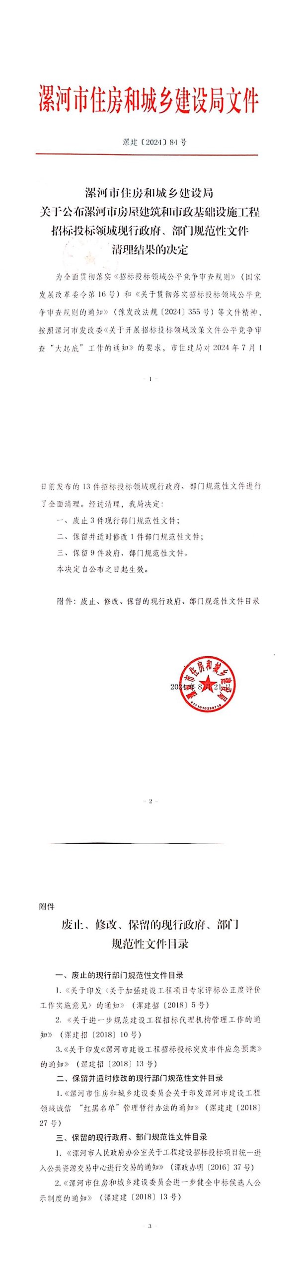 漯河市住房和城乡建设局文件深建〔2024】84号深河市住房和城乡建设局关于公布深河市房屋建筑和市政基础设施工程招标投标领域现行政府、部门规范性文件清理结果的决定为全面贯彻落实《招标投标领域公平竞争审查规则》(国家发展改革委令第16号)和《关于贯彻落实招标投标领域公平竞争审查规则的通知》(豫发改法规[2024]355号)等文件精神,按照深河市发改委《关于开展招标投标领域政策文件公平竞争审查“大起底”工作的通知》的要求,市住建局对2024年7月1