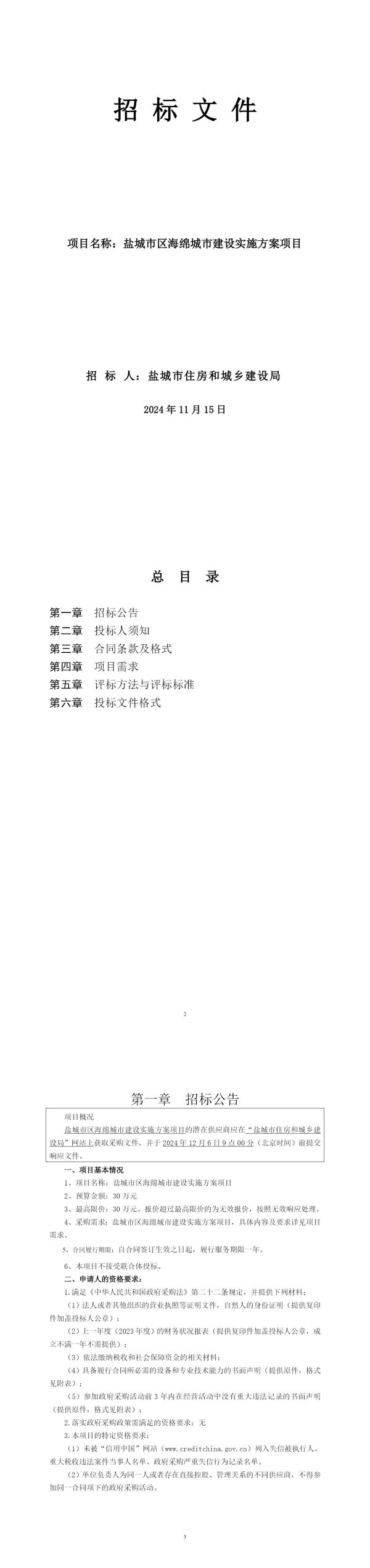 盐城市区海绵城市建设实施方案项目的潜在供应商应在“盐城市住房和城乡建设局”网站上获取采购文件,并于2024年12月6日9点00分(北京时间)前提交响应文件。