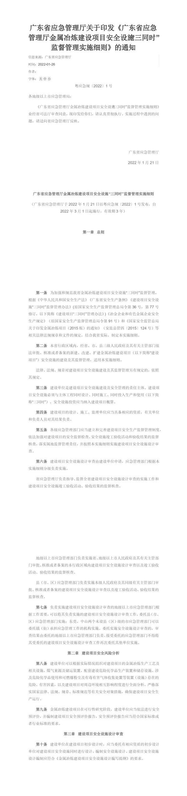 《广东省应急管理厅金属冶炼建设项目安全设施“三同时”监督管理实施细则》业经省司法厅审查同意,现印发给你们,请认真贯彻执行。实施过程中遇到的问题,请迳向省应急管理厅反映。
