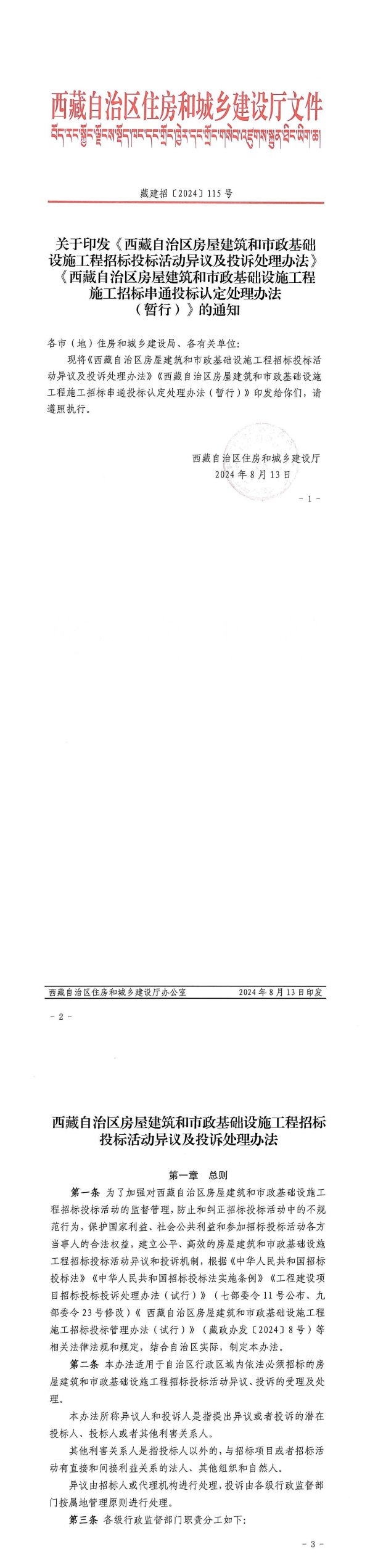西藏治区住房和城乡建设厅件2552藏建招[2024]115号关于印发《西藏自治区房屋建筑和市政基础设施工程招标投标活动异议及投诉处理办法》《西藏自治区房屋建筑和市政基础设施工程施工招标串通投标认定处理办法(暂)》的通知各市(地)住房和城乡建设局、各有关单位:现将《西藏自治区房屋建筑和市政基础设施工程招标投标活动异议及投诉处理办法》《西藏自治区房屋建筑和市政基础设施工程施工招标串通投标认定处理办法(暂行)》印发给你们,请遵照执行。西藏自治区住房和城乡建设厅2024年8月13日-1-