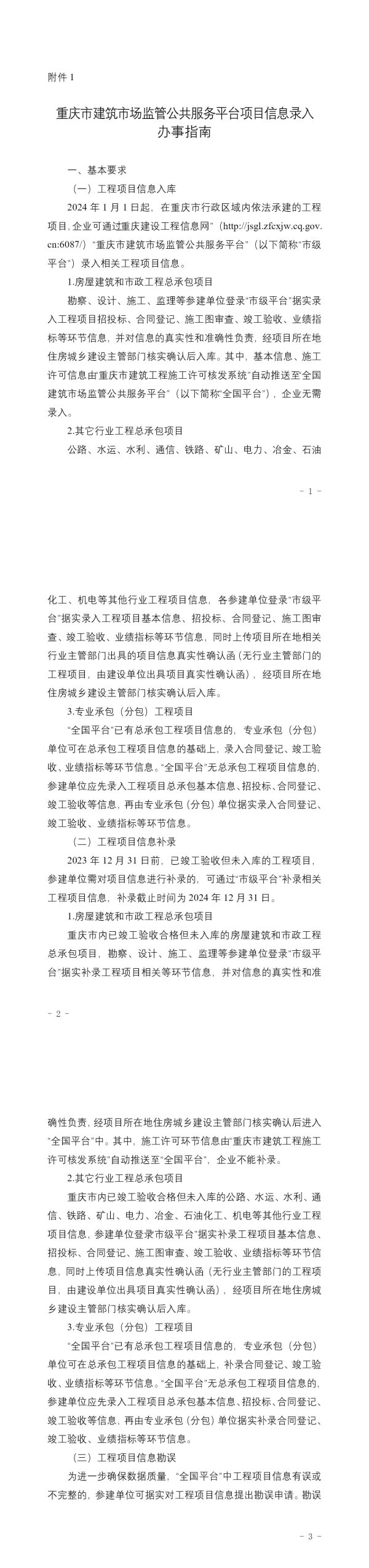 2024年1月1日起,在重庆市行政区域内依法承建的工程项目,企业可通过“重庆建设工程信息网”(http://jsgl.zfcxjw.cq.gov.cn:6087/)“重庆市建筑市场监管公共服务平台”(以下简称“市级平台”)录入相关工程项目信息。