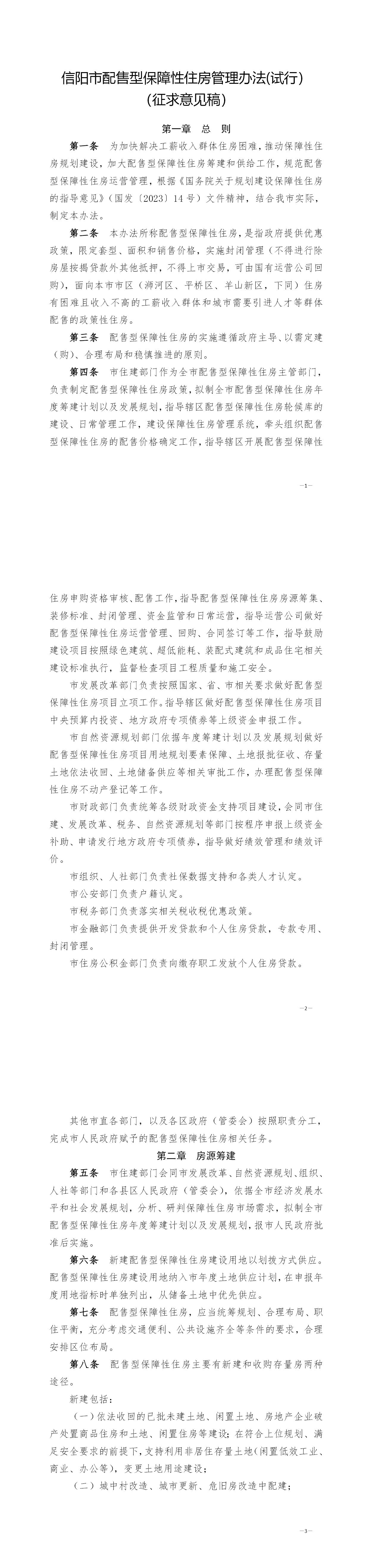 第二条 本办法所称配售型保障性住房,是指政府提供优惠政策,限定套型、面积和销售价格,实施封闭管理(不得进行除房屋按揭贷款外其他抵押,不得上市交易,可由国有运营公司回购),面向本市市区(浉河区、平桥区、羊山新区,下同)住房有困难且收入不高的工薪收入群体和城市需要引进人才等群体配售的政策性住房。