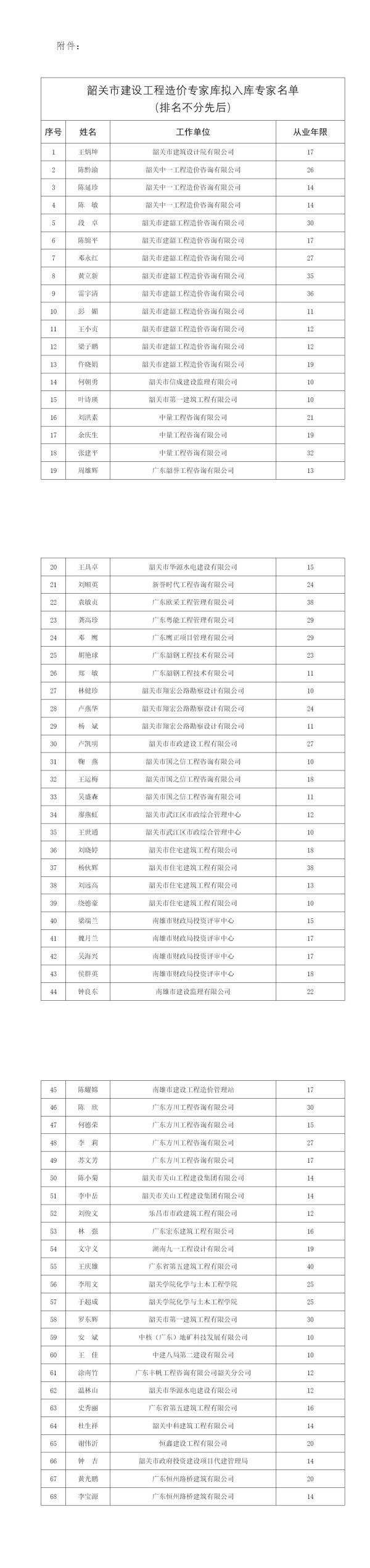 韶关市建设工程造价专家库拟入库专家名单(排名不分先后)