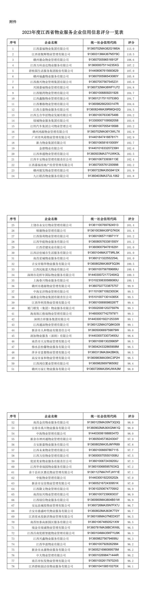 附件2023年度江西省物业服务企业信用信息评分一览表序号企业名称统一社会信用代码评分1江西嘉福物业集团有限公司91360702MA382G1M0A113.02江西省舰辉物业管理有限公司91360313MA367N5Y9C110.53赣州德众物业管理有限公司91360700596516912F108.64江西万科益达物业服务有限公司9136000075114235XG107.25碧桂园生活服务集团股份有限公司914406067615683629107.06赣州福鑫物业服务有限公司91360700596543080Y105.87江西燕兴物业管理集团有限公司913607007567545231105.08兴国嘉福物业管理有限公司91360732MA38WFYJ72104.89江西银湾物业管理有限公司913601006809201926104.710江西鑫勤物业管理有限公司91360121751107538G104.711江西赛格物业管理有限公司91360982662003147R104.612江西吉嘉物业服务有限公司91360824MA39RMQH2Q104.513江西五合华居物业发展有限公司913601007633675486104.214绿城物业服务集团有限公司913300007109582058103.615江铃汽车集团公司物业管理公司913601007055419588103.216赣州鸿源物业管理有限公司91360702MA36Y3WL7X102.917广州市凤萌物业管理有限公司914401847418878171102.918新力物业集团有限公司91360106581610009Y102.719金碧物业有限公司91440101633207239H102.620江西和通物业管理有限公司91360503MA37YUWK3L102.521江西丰安物业管理有限责任公司91360106733936113E102.422江西嘉福房地产经营管理有限公司913607005761200998102.223赣州骏发物业管理有限公司91360722MA35G9412X101.924九江联昌物业服务有限公司91360403MA37UL1062101.8