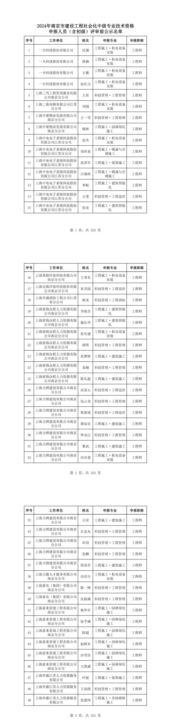 2024年南京市建设工程社会化中级专业技术资格申报人员(含初级)评审前公示名单序号工作单位姓名申报专业申报职称1夫科技股份有限公司沈强工程施工·机电设备安装工程师2一夫科技股份有限公司唐楠工程施工·机电设备安装工程师3人一夫科技股份有限公司王薇工程施工·机电设备安装工程师4一夫科技股份有限公司赵长玉工程施工·机电设备安装工程师5上海三笃工程管理服务有限公司南京分公司王雷科技管理·工程管理工程师6上海三菱电梯有限公司江苏刘刚工程施工·机电设备分公司安装工程师7上海中梁物业发展有限公司南京分公司王一雪科技管理·工程管理工程师8上海中梁物业发展有限公司锡林工程施工·园林绿化南京分公司施工工程师9上海中电电子系统科技股份有限公司江苏分公司张杰工程施工·机电设备安装工程师10上海中电电子系统科技股份郑科弟工程施工·暖通与空有限公司江苏分公司调施工工程师11上海中电电子系统科技股份有限公司江苏分公司张泽军工程施工·装饰施工工程师12上海中电电子系统科技股份有限公司江苏分公司吕瑞祥工程施工·暖通与空调施工工程师13上海中电电子系统科技股份有限公司江苏分公司李魁工程施工·建筑智能化工程师14上海中电电子系统科技股份有限公司江苏分公司王斐科技管理·工程造价工程师15上海中电电子系统科技股份张竞工程施工·建筑智能有限公司江苏分公司化工程师第1页,共323页
