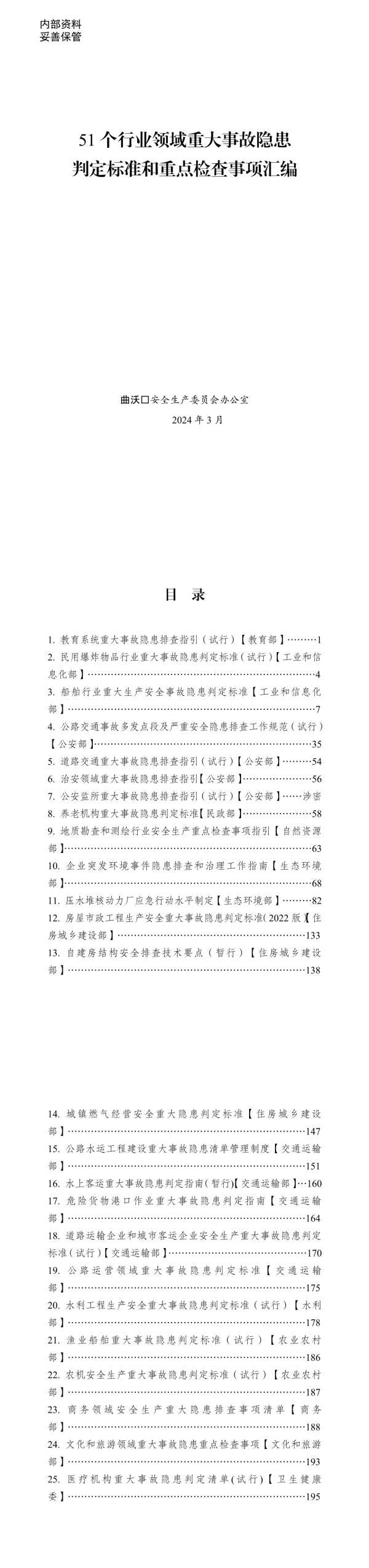 妥善保管内部资料51个行业领域重大事故隐患判定标准和重点检查事项汇编曲沃安全生产委员会办公室2024年3月