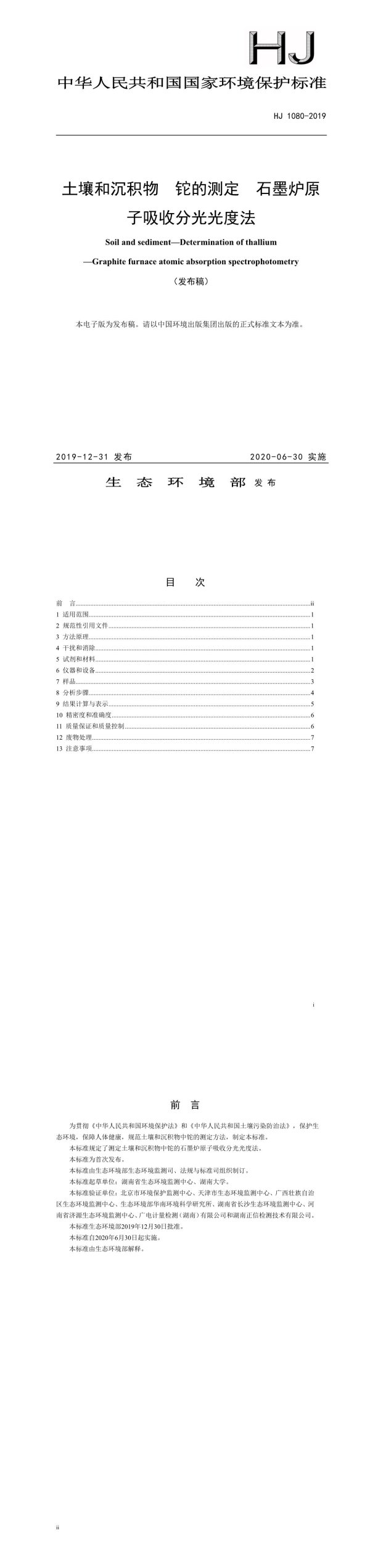 前言为贯彻《中华民共和国环境保护法》和《中华民共和国壤污染防治法》,保护态环境,保障人体健康,规范土壤和沉积物中铊的测定方法,制定本标准。本标准规定了测定土壤和沉积物中铊的石墨炉原子吸收分光光度法。本标准为首次发布。本标准由生态环境部生态环境监测司、法规与标准司组织制订。本标准起草单位:湖南省生态环境监测中心、湖南大学。本标准验证单位:北京市环境保护监测中心、天津市生态环境监测中心、广西壮族自治区生态环境监测中心、生态环境部华南环境科学研究所、湖南省长沙生态环境监测中心、河南省济源生态环境监测中心、广电计量检测(湖南)有限公司和湖南正信检测技术有限公司。本标准生态环境部2019年12月30日批准。本标准自2020年6月30日起实施。本标准由生态环境部解释。ii
