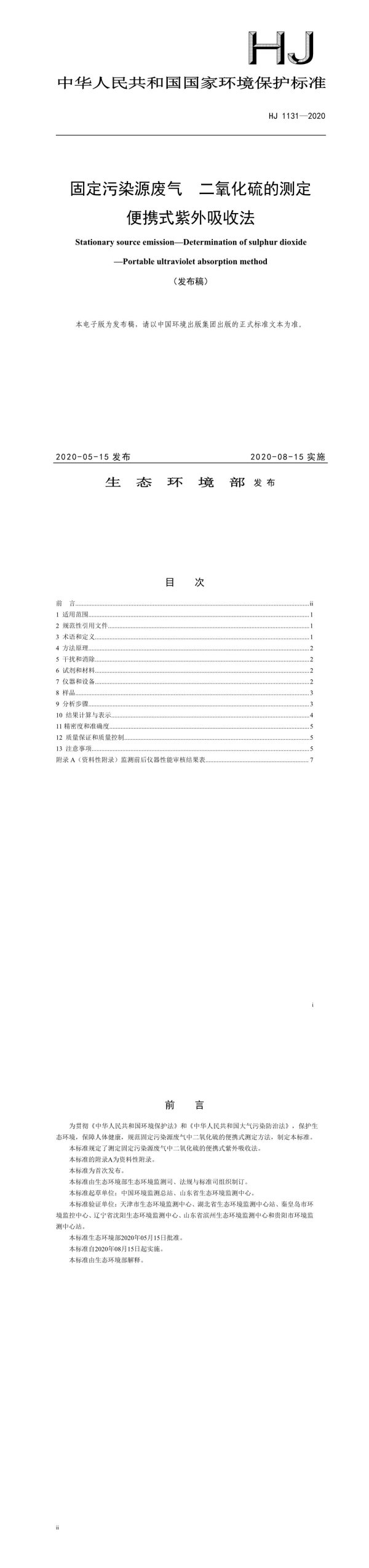 前言为贯彻《中华人民共和国环境保护法》和《中华人民共和国大气污染防治法》,保护生态环境,保障人体健康,规范固定污染源废气中二氧化硫的便携式测定方法,制定本标准。本标准规定了测定固定污染源废气中二氧化硫的便携式紫外吸收法。本标准的附录A为资料性附录。本标准为首次发布。本标准由生态环境部生态环境监测司、法规与标准司组织制订。本标准起草单位:中国环境监测总站、东省生态环境监测中心。本标准验证单位:天津市生态环境监测中心、湖北省生态环境监测中心站、秦皇岛市环境监控中心、辽宁省沈阳生态环境监测中心、山东省滨州生态环境监测中心和贵阳市环境监测中心站。本标准生态环境部2020年05月15日批准。本标准自2020年08月15日起实施。本标准由生态环境部解释。ii
