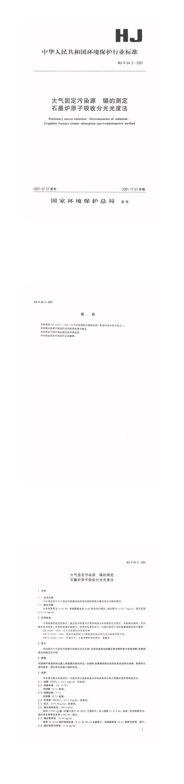 HJ中华人民共和国环境保护行业标准HJ/T64.2—2001大气固定污染源镉的测定石墨炉原子吸收分光光度法Stationarysourceemission—Determinationofcadmium-Graphiticfurnaceatomicabsorptionspectrophotometricmethod2001-07-27发布2001-11-01实施国家环境保护总局发布