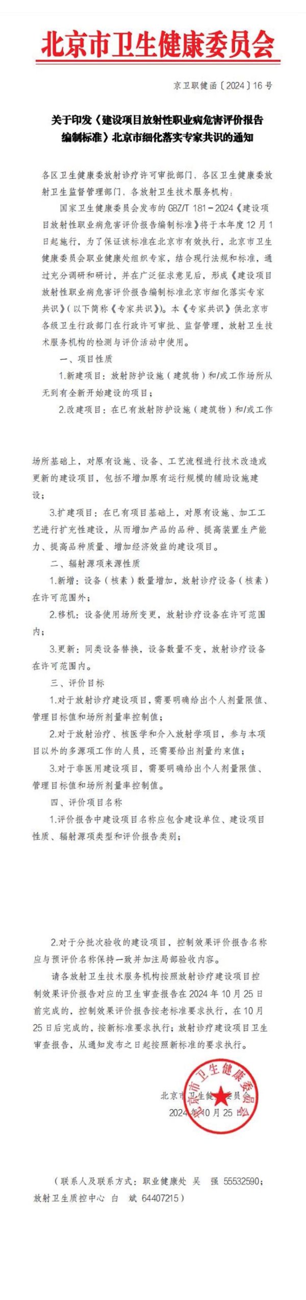 北京市卫生健康委员会京卫职健函〔2024)16号关于印发<建设项目放射性职业病危害评价报告编制标准)北京市细化落实专家共识的通知各区卫生健康委放射诊疗许可审批部门,各区卫生健康委放射卫生监督管理部门,各放射卫生技术服务机构:国家卫生健康委员会发布的GBZ/T181-2024《建设项目放射性职业病危害评价报告编制标准》将于本年度12月1日起施行,为了保证该标准在北京市有效执行,北京市卫生健康委员会职业健康处组织专家,结合现行法规和标准,通过充分调研和研讨,并在广泛征求意见后,形成《建设项目放射性职业病危害评价报告编制标准北京市细化落实专家共识》(以下简称《专家共识》)。本《专家共识》供北京市各级卫生行政部门在行政许可审批、监督管理,放射卫生技术服务机构的检测与评价活动中使用。一、项目性质1.新建项目:放射防护设施(建筑物)和/或工作场所从无到有全新开始建设的项目:2.改建项目:在已有放射防护设施(建筑物)和/或工作