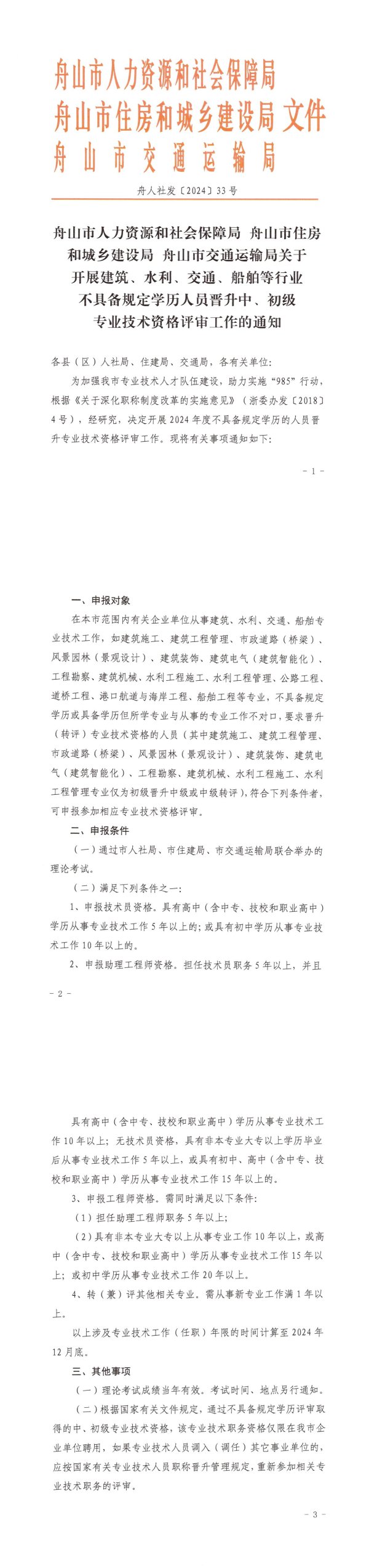 舟山市人力资源和社会保障局舟山市住房和城乡建设局文件舟山市交通运输局舟人社发[2024]33号舟山市人力资源和社会保障局舟山市住房和城乡建设局舟山市交通运输局关于开展建筑、水利、交通、船舶等行业不具备规定学历人员晋升中、初级专业技术资格评审工作的通知各县(区)人社局、住建局、交通局,各有关单位:为加强我市专业技术人才队伍建设,助力实施“985”行动,根据《关于深化职称制度改革的实施意见》(浙委办发[2018】4号),经研究,决定开展2024年度不具备规定学历的人员晋升专业技术资格评审工作。现将有关事项通知如下: