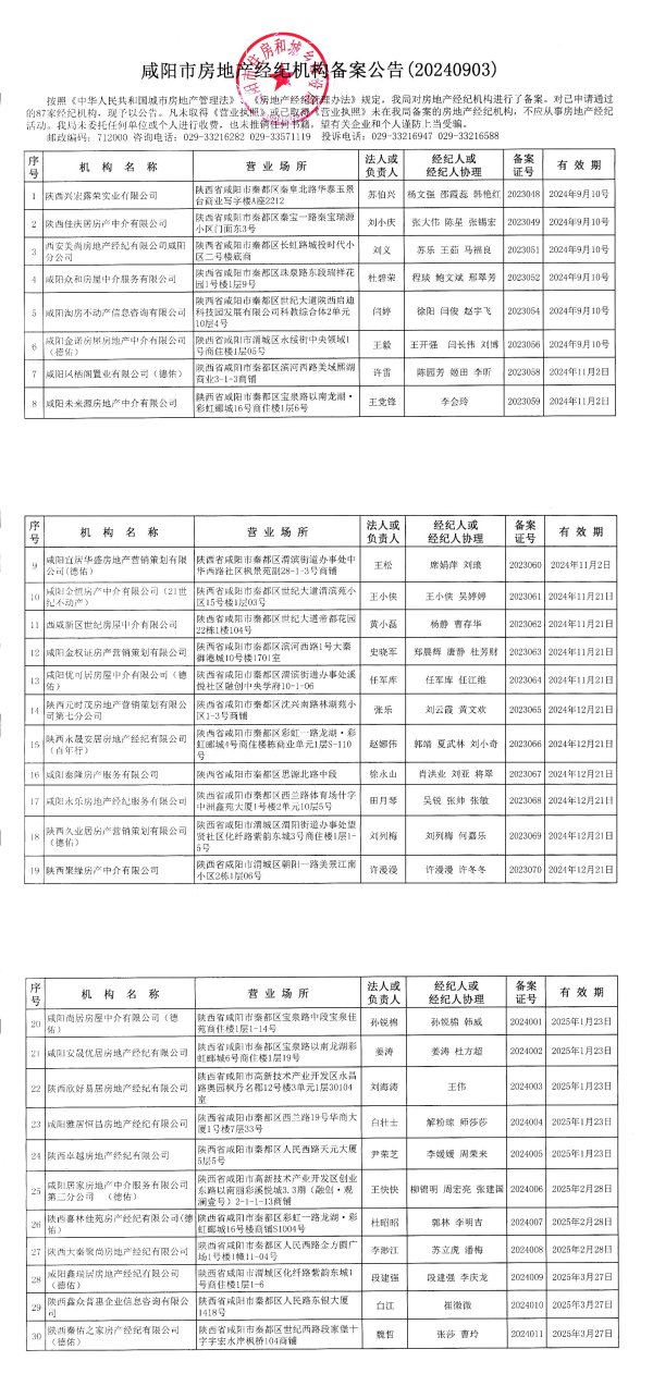 房和城咸阳市房地经纪机构本备案公告(20240903)用按照《中华人民共和国城市房地产管理法》《房地产经管理办法》规定,我局对房地产经纪机构进行了备案。对已申请通过的87家经纪机构,现予以公告。凡未取得《营业执照》惑已取得《营业执照》未在我局备案的房地产经纪机构,不应从事房地产经纪活动。我局未委托任何单位或个人进行收费,也未推销任何书籍,望有关企业和个人谨防上当受骗。邮政编码:712000咨询电话:029-33216282029-33571119投诉电话:029-33216947029-33216588序号机构名称营业场所法人或经纪人或负责人经纪人协理证号备案有效期1陕西兴宏露荣实业有限公司陕西省咸阳市秦都区秦皇北路华泰玉景台商业写字楼A座2212苏伯兴杨文强邵霞蕊韩艳红20230482024年9月10号2陕西佳庆居房产中介有限公司陕西省咸阳市秦都区秦宝一路秦宝瑞源小区门面东3号刘小庆张大伟陈星张锡宏20230492024年9月10号3西安美尚房地产经纪有限公司咸阳陕西省咸阳市秦都区长虹路城投时代小分公司区二号楼底商刘义苏乐王茹马福良20230512024年9月10号4咸阳众和房屋中介服务有限公司陕西省咸阳市秦都区珠泉路东段瑞祥花园1号楼1层9号杜碧荣程琰鲍文斌邢翠芳20230522024年9月10号陕西省咸阳市秦都区世纪大道陕西启迪5咸阳淘房不动产信息咨询有限公司科技园发展有限公司科教综合体2单元闫婷徐阳闫俊赵宇飞20230542024年9月10号10层4号6咸阳金诺房屋房地产中介有限公司陕西省咸阳市渭城区永绥街中央领域1(德佑)号商住楼1层05号王毅王开强闫长伟刘博20230562024年9月10号7咸阳凤栖阁置业有限公司(德佑)陕西省咸阳市秦都区滨河西路美域熙湖商业3-1-3商铺许雷陈园芳姬田李昕20230582024年11月2日8咸阳未来源房地产中介有限公司陕西省咸阳市秦都区宝泉路以南龙湖·彩虹郦城16号商住楼1层6号王党锋李会玲20230592024年11月2日