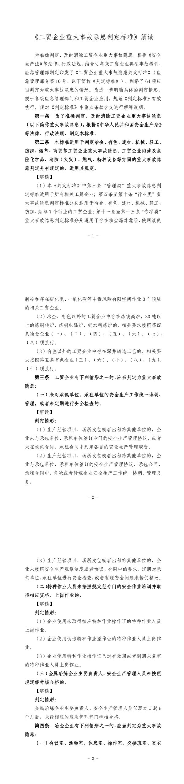 《工贸企业重大事故隐患判定标准》解读为准确判定、及时消除工贸企业重大事故隐患,根据《安全生产法》等法律、行政法规,结合近年来工贸企业典型事故教训,应急管理部制定印发了《工贸企业重大事故隐患判定标准》(应急管理部令第10号,以下简称《判定标准》),列举了64项应当判定为重大事故隐患的情形。为进一步明确具体的判定情形,便于各级应急管理部门和工贸企业应用,规范《判定标准》有效执行,现对《判定标准》中重点条款含义进行解释说明。第一条为了准确判定、及时消除工贸企业重大事故隐患(以下简称重大事故隐患),根据《中华人民共和国安全生产法》等法律、行政法规,制定本标准。第二条本标准适用于判定冶金、有色、建材、机械、轻工、纺织、烟草、商贸等工贸企业重大事故隐患。工贸企业内涉及危险化学品、消防(火灾)、燃气、特种设备等方面的重大事故隐患判定另有规定的,适用其规定。【解读】(1)本《判定标准》中第三条“管理类”重大事故隐患判定标准适用于所有相关工贸企业;第四条至第十条“行业类”重大事故隐患判定标准分别适用于冶金、有色、建材、机械、轻工、纺织、烟草7个行业的工贸企业;第十一条至第十三条“专项类”重大事故隐患判定标准分别适用于存在粉尘爆炸危险、使用液氨-1