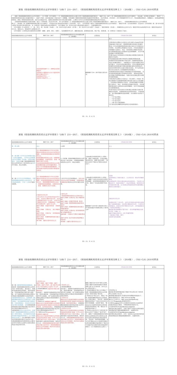 新版《检验检测机构资质认定评审准则》与RB/T214一2017、《检验检测机构资质认定评审准则及释义》(2016版)、CNAS-CL01:2018对照表新版《检验检测机构资质认定评审准则》(以下简称《评审准则》)在《检验检测机构资质认定能力评价检验检测机构通用要求》(RB/T214—2017)和《检验检测机构资质认定评审准则》(2016版)及其释义的基础上,吸纳了《检测和校准实验室能力的通用要求》(GB/T27025—2019/ISO/IEC17025:2017)的精髓,同时兼顾了我国对检验检测市场强制管理的要求,从评审要求、评审程序、评审考核细则等环节入手。突出强调法律地位、检测能力、结果追溯等刚性要求。降低了原则性条款的比例,减少自由裁量空间,强调以客观事实及符合性证据为依据。主要用于评审人员对检验检测机构的技术评审活动。为帮助检验检测机构/实验室转换(建立)管理体系,经过比对分析,将《评审准则》与《检验检测机构资质认定能力评价检验检测机构通用要求》(RB/T2142017)、《检验检测机构资质认定评审准则及释义》(2016版)和《检测和校准实验室能力认可准则》(CNAS-CL01:2018)的异同进行了合体对照,其中:《评审准则》附件4《检验检测机构资质认定评审准则》一般程序审查(告知承诺核查)表是对应《评审准则》第二章“评审内容与要求”的具体审查/核查内容,本《对照表》将附件4的内容对照排列于《评审准则》第二章评审内容与要求的相应条款下,方便理解和对比。《评审准则》全四章共条,其中:第章总则(共6条),第章评审内容与要求(共7条),第三章评审式与程序(共6条),第四章附则(共2条),明确资质认定评审分为般程序和告知承诺程序以及般程序的技术评审方式,规范定义,增加附件1-4的配套文件。《评审准则》主要变化涉及架构和内容调整(删除、新增、修订、保留),包括删除参考件,删除条款6条;新增条款10条;修订7条;保留4条。本《对照表》全部进行了标注。检验检测机构资质认定评审准则RB/T214—2017检验检测机构资质认定评审准则及释义(2016版)主要变化CNAS-CL01:2018异同点前言前言中国合格评定国家认可委员会(英文缩写:CNAS)等同采用ISO/IEC17025:2017《检测和校准实验室能力的通用要求》作为对检测和校准实验室能力进行认可的基本认可准则。
