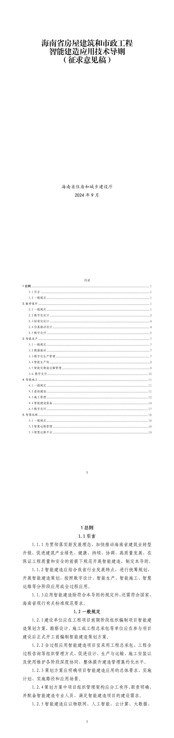 海南省房屋建筑和市政工程智能建造应用技术导则(征求意见稿)海南省住房和城乡建设厅2024年9月