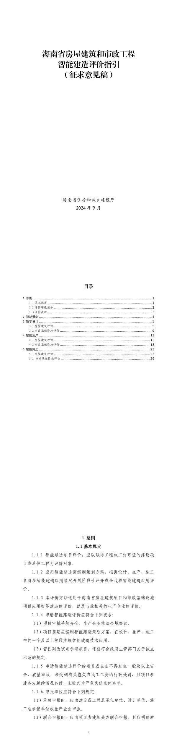 海南省房屋建筑和市政工程智能建造评价指引(征求意见稿)海南省住房和城乡建设厅2024年9月