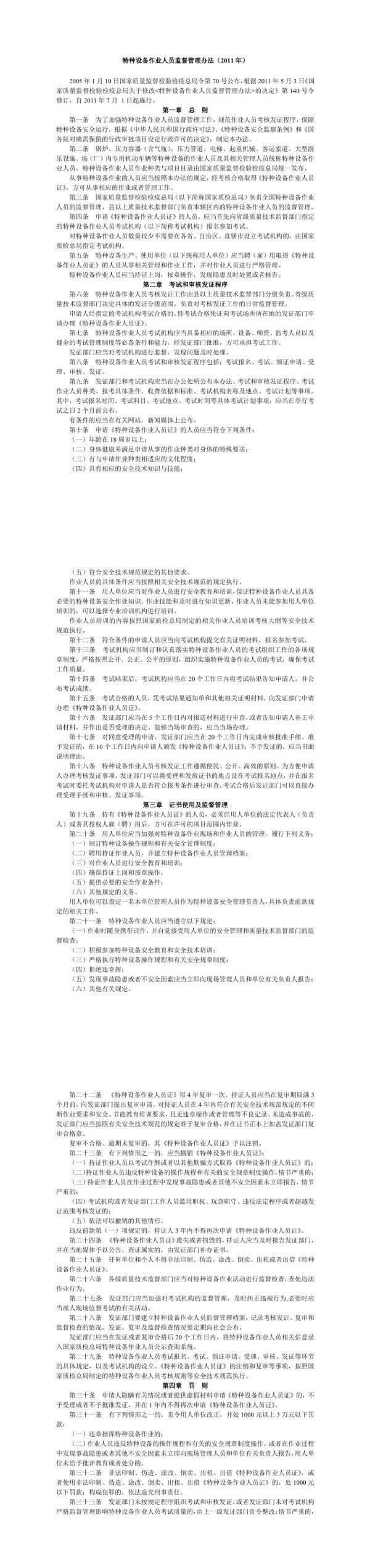特种设备作业人员监督管理办法(2011年)2005年110国家质量监督检验检疫总局令第70号公布,根据2011年53《国家质量监督检验检疫总局关于修改<特种设备作业人员监督管理办法>的决定》第140号令修订,自2011年7月1起施行。第一章总则第一条为了加强特种设备作业人员监督管理工作,规范作业人员考核发证程序,保障特种设备安全运行,根据《中华民共和国政许可法》、《特种设备安全监察条例》和《国务院对确需保留的行政审批项目设定行政许可的决定》,制定本办法。第条锅炉、压力容器(含瓶)、压管道、电梯、起重机械、客运索道、型游乐设施、场(厂)内专用机动车辆等特种设备的作业人员及其相关管理人员统称特种设备作业人员。特种设备作业人员作业种类与项目目录由国家质量监督检验检疫总局统一发布。从事特种设备作业的人员应当按照本办法的规定,经考核合格取得《特种设备作业人员证》,方可从事相应的作业或者管理工作。第三条国家质量监督检验检疫总局(以下简称国家质检总局)负责全国特种设备作业人员的监督管理,县以上质量技术监督部门负责本辖区内的特种设备作业人员的监督管理。第四条申请《特种设备作业人员证》的人员,应当首先向省级质量技术监督部门指定的特种设备作业人员考试机构(以下简称考试机构)报名参加考试。对特种设备作业人员数量较少不需要在各省、自治区、直辖市设立考试机构的,由国家质检总局指定考试机构。第五条特种设备生产、使用单位(以下统称用人单位)应当聘(雇)用取得《特种设备作业人员证》的人员从事相关管理和作业工作,并对作业人员进行严格管理。特种设备作业人员应当持证上岗,按章操作,发现隐患及时处置或者报告。第二章考试和审核发证程序第六条特种设备作业员考核发证工作由县以上质量技术监督部门分级负责。省级质量技术监督部门决定具体的发证分级范围,负责对考核发证工作的日常监督管理。申请人经指定的考试机构考试合格的,持考试合格凭证向考试场所所在地的发证部门申请办理《特种设备作业人员证》。第七条特种设备作业人员考试机构应当具备相应的场所、设备、师资、监考人员以及健全的考试管理制度等必备条件和能力,经发证部门批准,方可承担考试工作。发证部门应当对考试机构进行监督,发现问题及时处理。第八条特种设备作业人员考试和审核发证程序包括:考试报名、考试、领证申请、受理、审核、发证。第九条发证部门和考试机构应当在办公处所公布本办法、