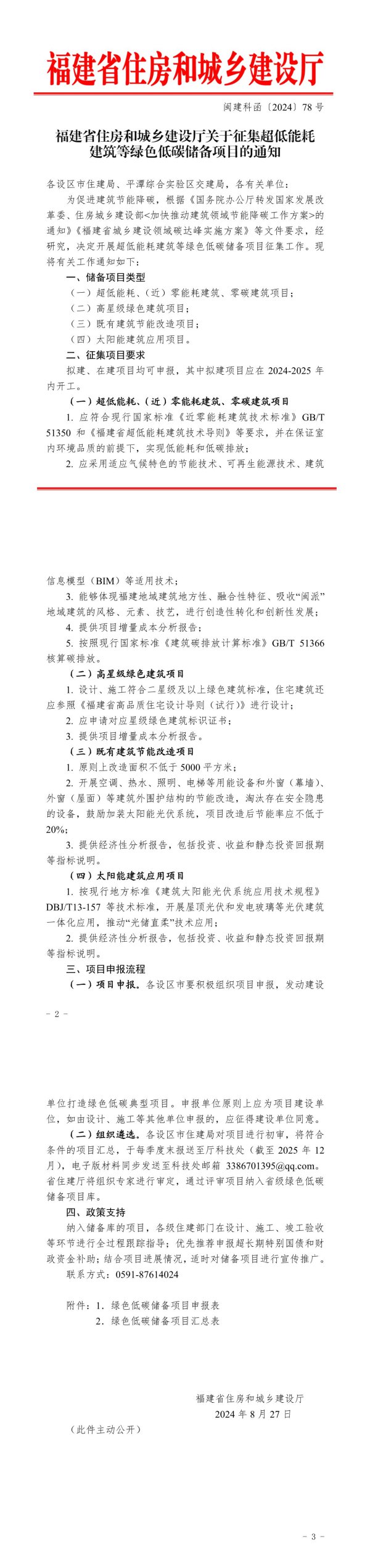 福建省住房和城乡建设厅闽建科函〔2024)78号福建省住房和城乡建设厅关於征集超低能耗建筑等绿色低碳储备项目的通知各设区市住建局、平潭综合实验区交建局,各有关单位:为促进建筑节能降碳,根据《国务院办公厅转发国家发展改革委、住房城乡建设部<加快推动建筑领域节能降碳工作方案>的通知》《福建省城乡建设领域碳达峰实施方案》等文件要求,经研究,决定开展超低能耗建筑等绿色低碳储备项目征集工作。现将有关工作通知如下:一、储备项目类型(一)超低能耗、(近)零能耗建筑、零碳建筑项目;(二)高星级绿色建筑项目;(三)既有建筑节能改造项目;(四)太阳能建筑应用项目。二、征集项目要求拟建、在建项目均可申报,其中拟建项目应在2024-2025年内开工。(一)超低能耗、(近)零能耗建筑、零碳建筑项目1.应符合现行国家标准《近零能耗建筑技术标准》GB/T51350和《福建省超低能耗建筑技术导则》等要求,并在保证室内环境品质的前提下,实现低能耗和低碳排放;2.应采用适应气候特色的节能技术、可再生能源技术、建筑