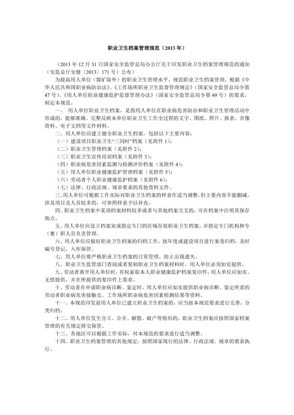职业卫生档案管理规范(2013年)(2013年12月31日国家安全监管总局办公厅关于印发职业卫生档案管理规范的通知(安监总厅安健〔2013)171号)公布)为提高用人单位(煤矿除外)的职业卫生管理水平,规范职业卫生档案管理,根据《中华民共和国职业病防治法》、《作场所职业卫生监督管理规定》(国家安全监管总局令第47号)、《用人单位职业健康监护监督管理办法》(国家安全监管总局令第49号)的要求,制定本规范。、用人单位职业卫生档案,是指用人单位在职业病危害防治和职业卫生管理活动中形成的,能够准确、完整反映本单位职业卫生工作全过程的文字、图纸、照片、报表、音像资料、电子文档等文件材料。二、用人单位应建立健全职业卫生档案,包括以下主要内容:(一)建设项目职业卫生“三同时”档案(见附件1);(二)职业卫生管理档案(见附件2);(三)职业卫生宣传培训档案(见附件3):(四)职业病危害因素监测与检测评价档案(见附件4);(五)用人单位职业健康监护管理档案(见附件5);(六)劳动者个人职业健康监护档案(见附件6);(七)法律、行政法规、规章要求的其他资料文件。三、用人单位可根据工作实际对职业卫生档案的样表作适当调整,但主要内容不能删减。涉及项目及人员较多的,可参照样表予以补充。四、职业卫生档案中某项档案材料较多或者与其他档案交叉的,可在档案中注明其保存地点。五、用人单位应设立档案室或指定专门的区域存放职业卫生档案,并指定专门机构和专(兼)职人员负责管理。六、用人单位应做好职业卫生档案的归档工作,按年度或建设项目进行案卷归档,及时编号登记,入库保管。七、用人单位要严格职业卫生档案的日常管理,防止出现遗失。八、职业卫生监管部门查阅或者复制职业卫生档案材料时,用人单位必须如实提供。九、劳动者离开用人单位时,有权索取本人职业健康监护档案复印件,用人单位应如实、无偿提供,并在所提供的复印件上签章。十、劳动者在申请职业病诊断、鉴定时,用人单位应如实提供职业病诊断、鉴定所需的劳动者职业病危害接触史、工作场所职业病危害因素检测结果等资料。十一、本规范印发前用人单位已建立职业卫生档案的,应当按本规范要求进行完善,分类归档。十二、用人单位发生分立、合并、解散、破产等情形的,职业卫生档案应按照国家档案管理的有关规定移交保管。十三、各地区可以根据工作实际,对本规范的要求进行适当调整。十四、职业卫生档案管理的