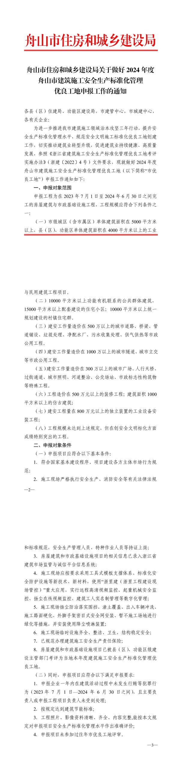 舟山市住房和城乡建设局舟山市住房和城乡建设局关于做好2024年度舟山市建筑施工安全生产标准化管理优良工地申报工作的通知各县(区)住建局、功能区建设局,市建管中心,市城建中心,各有关企业:为进一步推进我市建筑施工领域治本攻坚三年行动,提升安全生产标准化管理水平,规范安全文明施工标准化优良工地创建工作,切实推动建筑业转型升级,促进建筑业持续健康、高质量发展,参照《浙江省建筑施工安全生产标准化管理优良工地考评实施办法》(浙建[2022】4号)文件要求,现就做好2024年度舟山市建筑施工安全生产标准化管理优良工地(以下简称“市优良工地”)申报工作通知如下:一、申报对象范围申报工程为在2023年7月1日至2024年6月30日之间完工的房屋建筑与市政基础设施工程,工程规模应符合下列条件之一:(一)市级城区(含市属区)单体建筑面积在5000平方米以上,县(区)、功能区单体建筑面积在4000平方米以上的工业