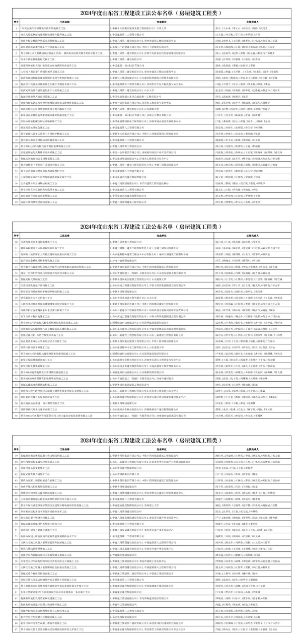 2024年度山东省工程建设工法公布名单(房屋建筑工程类)序号工法名称完成单位主要完成人1LNG双属全容储罐液压提升倒装施法1.中铁局集团建筑安装程有限公司2.天津学1彭云,2王永成,3李文山,4刘洪立,5周婷,6武艳芝2空跨度钢结构连廊拼装及整体提升施法1.中国建筑第程局有限公司1王强,2刘衡,3于涛,4孙承楼,5芦滨3变曲率偏椭圆伞状采光顶幕墙施法1.中建局第建设有限公司2.青州市建设程综合服务中1齐超,2商荣飞,3王洪娟,4孙重阳,5王化成,6焦雪松,7王艺4层建筑悬索柔性施平台快速施法1.上海冶建设有限公司2.中国冶集团有限公司1宋文智,2邵超峰,3王超,4郭锋,5洪陈超,6邢亮,7任冠宇5基于BIM技术悬挑超层混凝结构、钢结构及附着式脚架同步施法1.中建局第建设有限公司2.济南中央商务区投资建设集团有限公司1何,2孙丽华,3赵然,4张毅,5赵延淼,6杨兆伟,7林晓平6纤维板幕墙装配式施法1.中建局第建设有限公司1朱健,2汪丙阳,3宫献伟,4王振国,5张尊涛>双连跨架和跨门桁架组合结构两跨同步提升法1.中国建筑局(集团)有限公司1黄帅,2侯海涛,3李畅,4徐煌华,5李扬8空间“海浪型”蜂窝铝板吊顶施法1.中建局第建设有限公司2.青州市建设程综合服务中1党成强,2周鑫,3王洪娟,4王化成,5孙重阳,6陈奇,7张振恒9寒冷地区超低能耗建筑外围护系统密性控制施法1.中建科集团有限公司2.东建科特种建筑程技术有限公司1张将,2俞浩,3程海涛,4李远中,5马朝阳,6任翰,7刘学峰10超层底盘基础筏板跳仓法施关键技术施法1.中国建筑第五程局有限公司2.济南市历下区程质量与安全中1王超,2平晓宁,3汪宇,4郭希,5李金科,6罗俊,7李波11密拼式带肋叠合板智能化产与安装施法1.中建局第建设有限公司2.东学1杜志浩,2陈骁,3房海波,4侯和涛,5公维超,6曹志伟,7刘庆喜12超远距离堤坝直径顶管施法1.中国电建集团东电建设第程有限公司1佟英,2张松涛,3郭颜宾,4郑岩13钢结构住宅钢筋桁架楼承板楼浇筑撑架体系施法1.中交公局集团有限公司2.济南市程质量与安全中1刘江,2吴卓峰,3胡平平,4韩战洋,5赵东军,6储桂华14钢混结构核筒薄壁双钢板组合剪墙施法.中建局第建设有限公司2.东建筑学1董鹏,2赵然,3孙丽华,4刘哲,5杨帆,6刘帅,7吴超宇15新型堵孔装置提装配式墙体灌浆饱